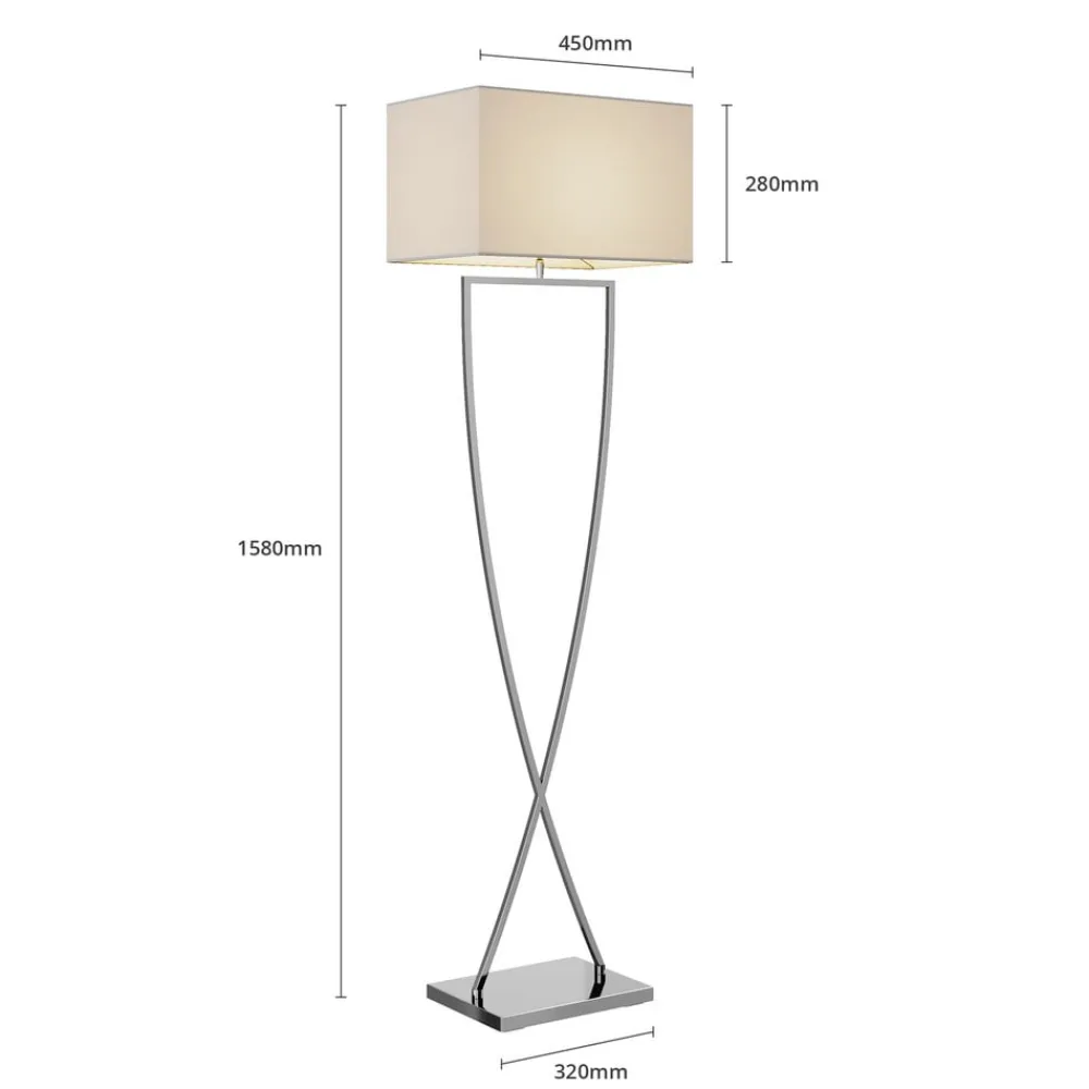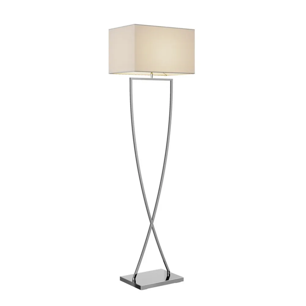 Elegant Evaine gulvlampe med hvit skjerm En kromfarget ramme, vakkert buet, danner basis for Evaine gulvlampe. Lampeskjermen, som har en moderne rektangulær design, er det ideelle supplementet med sin enkle hvite farge. Den skaper også en behagelig og stemningsfull atmosfære når lyset er på. Som indirekte lyskilde, for eksempel i stuen eller på soverommet, gir Evaine et vakkert, dempet lys og passer fint inn som et dekorativt innredningsobjekt. Gulvlampen slås enkelt av og på ved hjelp av en fotbryter.