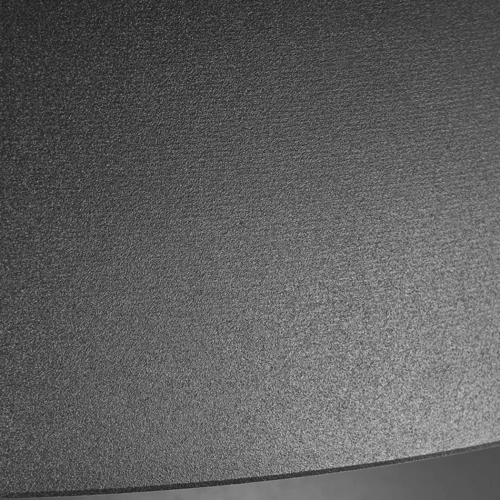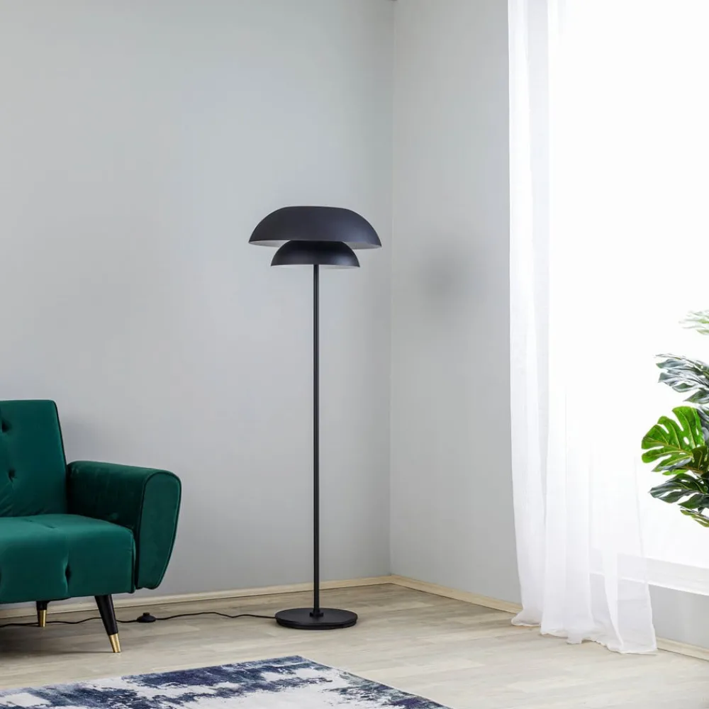 Designorientert gulvlampe Kellina i mørkt utseende Denne gulvlampen har en moderne design og tar seg godt ut i moderne omgivelser. Den er laget av jern og har en sandsvart overflatefinish. Den doble lampeskjermen med sin avrundede form nederst er midtpunktet i lampens utseende. Takket være skjermen sendes lyset ut blendingsfritt, noe som gjør denne armaturen egnet til en rekke formål. Den kan gjøre en god figur både i din egen stue og i en kommersiell setting, og ser ut som et stilig tilbehør til hjemmet selv når den er slått av.