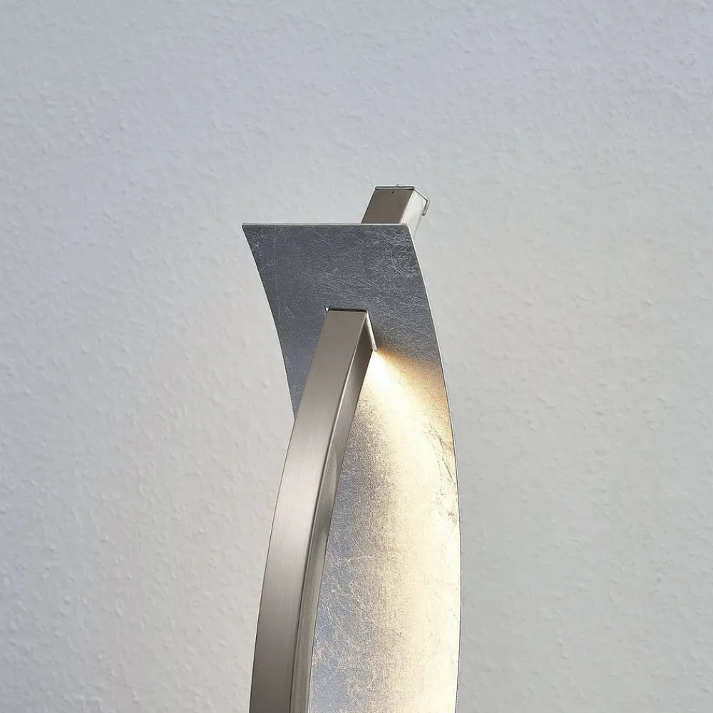 Et blikkfang i sølv: den moderne, slanke LED-bordlampen Marija Når du ser på den, kan resten av borddekorasjonen forsvinne helt i bakgrunnen. LED-bordlampen Marija står på en slank, rund fot i sølvfarge. Et lyselement stiger loddrett opp fra midten og har en svakt buet form som gir den et organisk preg. Det flate metalldekselet som er festet til lampen, tar opp fargetemaet i sokkelen og tiltrekker seg oppmerksomhet med sin sølvfargede overflate. LED-bordlampen Marija avgir et behagelig lys og kan dimmes i tre trinn ved hjelp av bryteren.