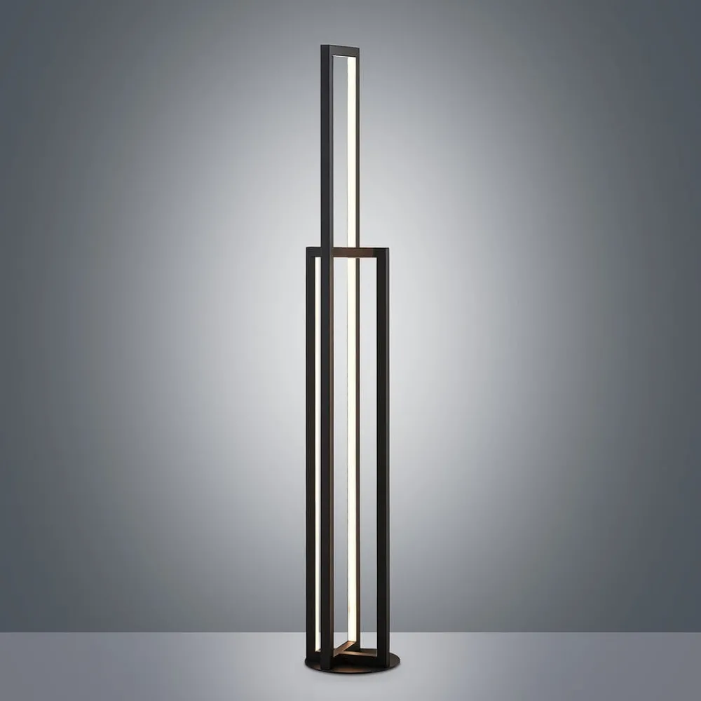 Matt svart Hylda LED-gulvlampe i grafisk design, med tretrinns dimmeteknologi Den grafiske designen og den matt svarte finishen gjør Hylda LED-gulvlampe til en moderne lyskilde som kjennetegnes av en indirekte og svært behagelig lysfordeling. LED-lampene som avgir varmhvitt lys, er montert i de motstående metallrammene av aluminiumsprofiler på innsiden. Et satinert deksel sørger for et svært homogent lysbilde, slik at hele overflaten spotlighter jevnt og det skapes en blendingsfri lyseffekt. 3-trinns dimbar + av: Bryteren gjør det mulig å slå armaturen på og av som vanlig. Takket være 3-trinns dimmeteknologien med integrert av-funksjon kan den også dimmes til tre ulike lysstyrkenivåer ved å trykke på bryteren flere ganger: 100 %, 50 % og 10 %.