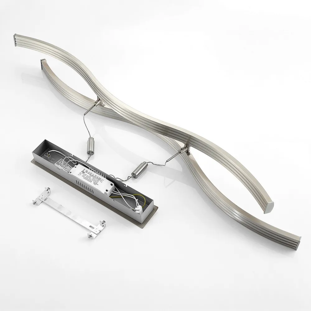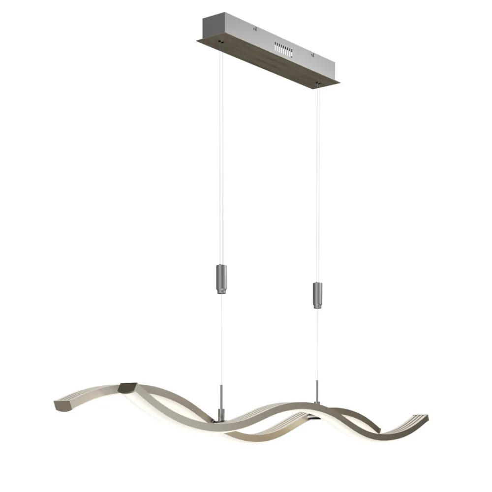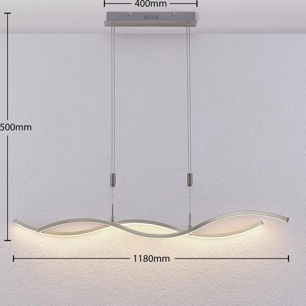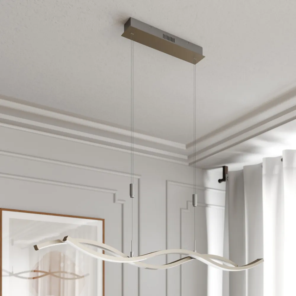 Mairia LED-hengelampe, høydejusterbar og dimbar via veggbryter Den puristiske designen til Mairia LED-hengelampe gir den en spesiell individualitet takket være de bølgeformede elementene. De energibesparende LED-lampene er festet på undersiden og gir en sterk belysning med varmhvitt lys. Opphengssystemet er høydejusterbart og kan justeres etter behov. Takket være den langstrakte formen er Mairia perfekt for plassering over et spisebord. Lysintensiteten kan dimmes i tre trinn ved hjelp av veggbryteren, noe som gjør lampen egnet for en koselig middag eller en spennende spillekveld – Høydejusterbar mellom 150 og 250 cm
