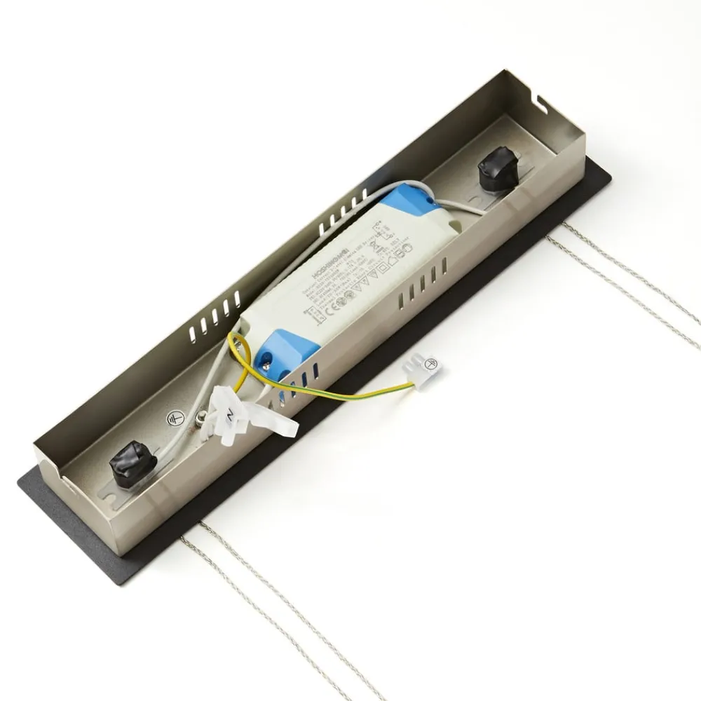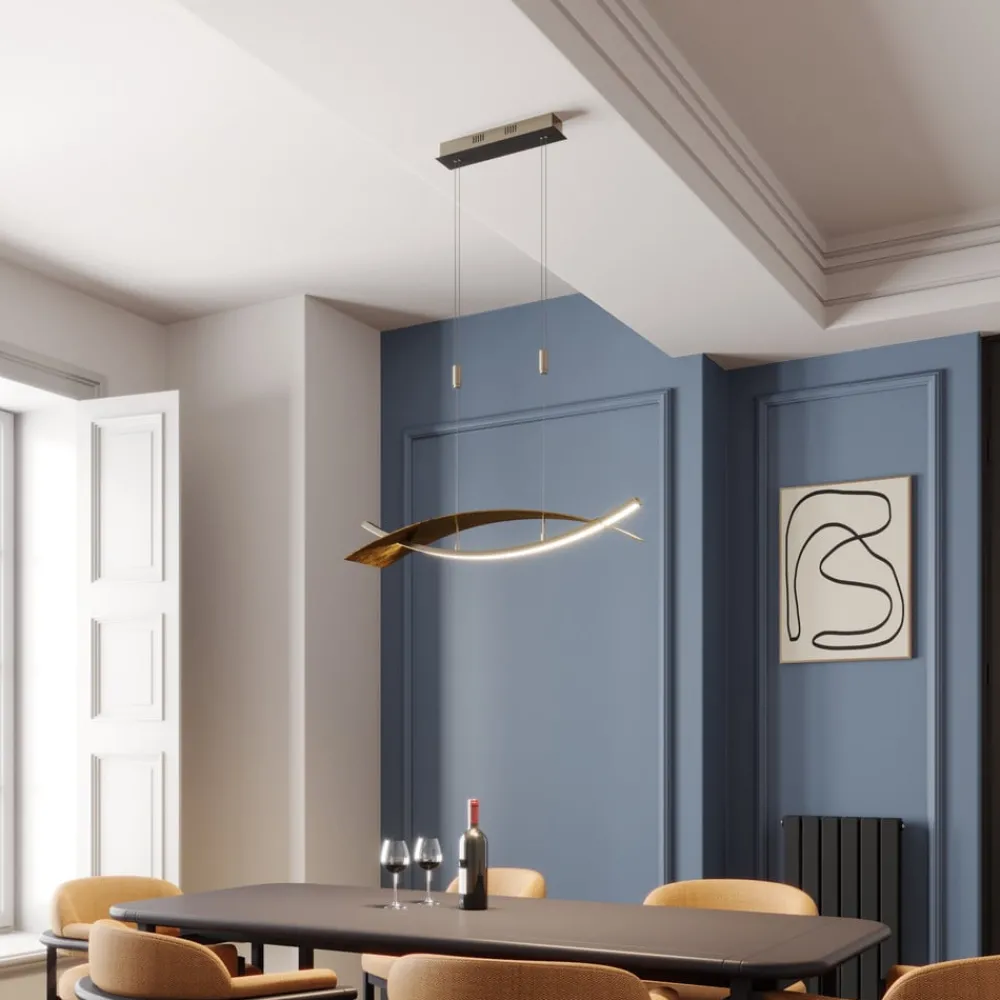 Buet LED-hengelampe Marija: horisontal skjerm i svart, høydejusterbar Hengelampen Marija er basert på et spill av farger og former. To robuste føringskabler går ned fra det slanke, rektangulære takopphenget og kobles til den horisontale skjermen. Opphengshøyden kan varieres. I ønsket høyde er metalldekselet elegant buet og kombinert med et buet rørpære i gull. Dette gir LED-hengelampen Marija et organisk utseende. Fargene gull og svart spiller sammen, noe som gjør at lampen vekker oppmerksomhet selv i dagslys. Effekten blir enda mer imponerende når LED-pæren er slått på. Fargetemperaturen ligger i det varmhvite området og passer derfor godt til en hjemmekoselig atmosfære. Lysstyrken kan justeres i tre trinn ved hjelp av veggbryteren.