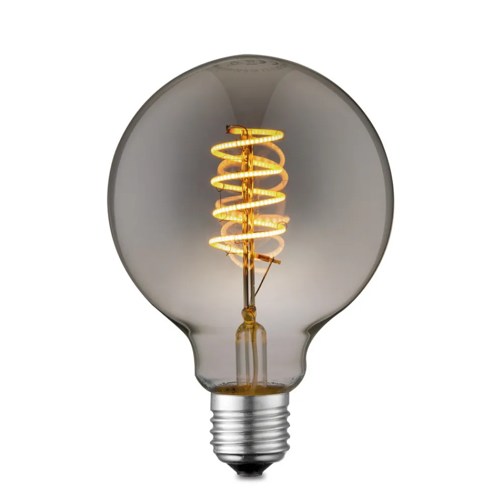 E27 G95 LED-globepære 4W i røykfarget look, dimbar, CRI >; 90 Denne E27 LED-globepæren imponerer med sitt slående utseende, som ikke bare skyldes den frodige formen, men også den røykgrå fargen på glasset. Den moderne LED-teknologien har lavt forbruk og gir et spesielt utseende takket være den spiralformede glødetrådstangen. Ved behov kan lampen dimmes ved hjelp av en faseavsnittdimmer i forkant eller bakkant. Den høye CRI-verdien gir spesielt god fargegjengivelse. Tekniske data – Dimbar via faseavsnittdimmer – Energiklasse B – Sammenligningsverdi: 5 W – Levetid: 25 000 timer – Koblingssykluser: 50 000 – Ytelsesfaktor >; 0,5 – CRI >; 90 Spesielle egenskaper – Filamentoptikk – Dekorativ karakter