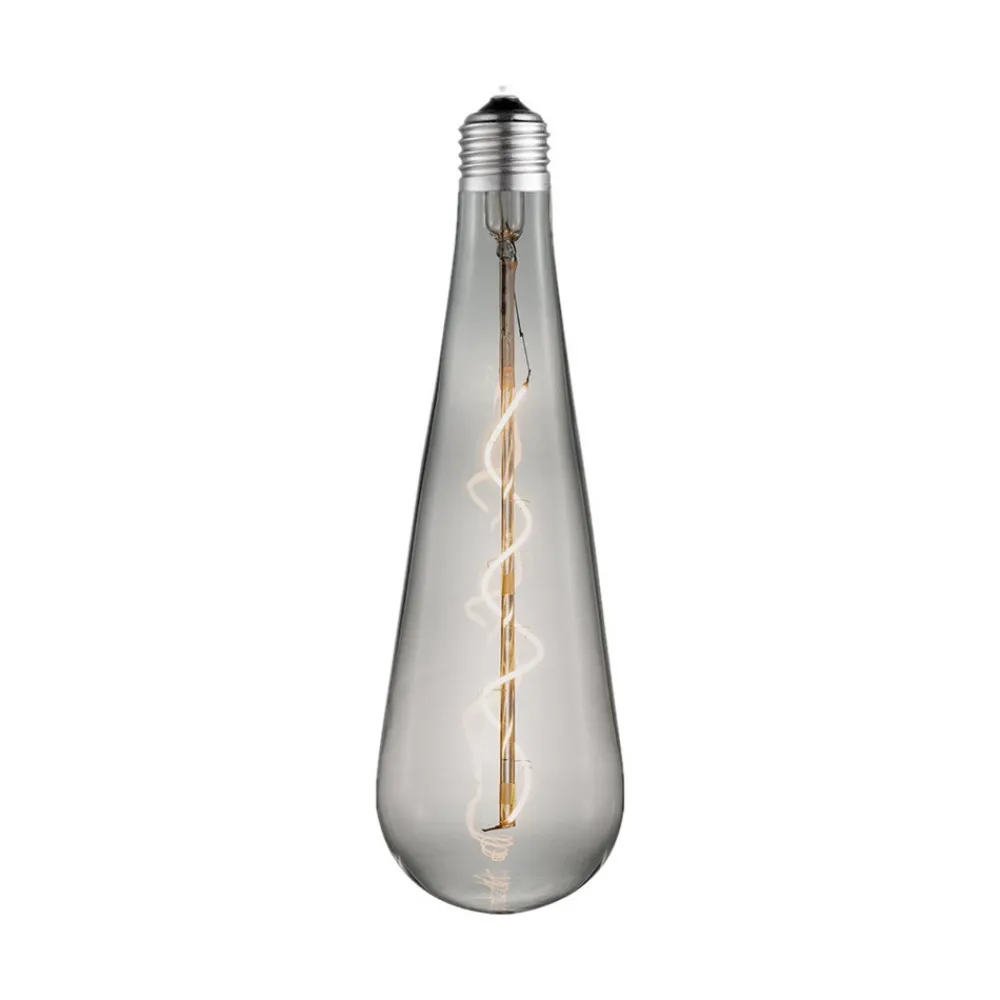Slående dekorativ lampe med E27-sokkel Denne E27-lampen med sin slående design gjør ethvert lys til noe helt spesielt. Det er en filamentpære med røykgrått glass. Den gir et varmhvitt lys og kan dimmes etter behov ved hjelp av en ekstern dimmer (medfølger ikke).