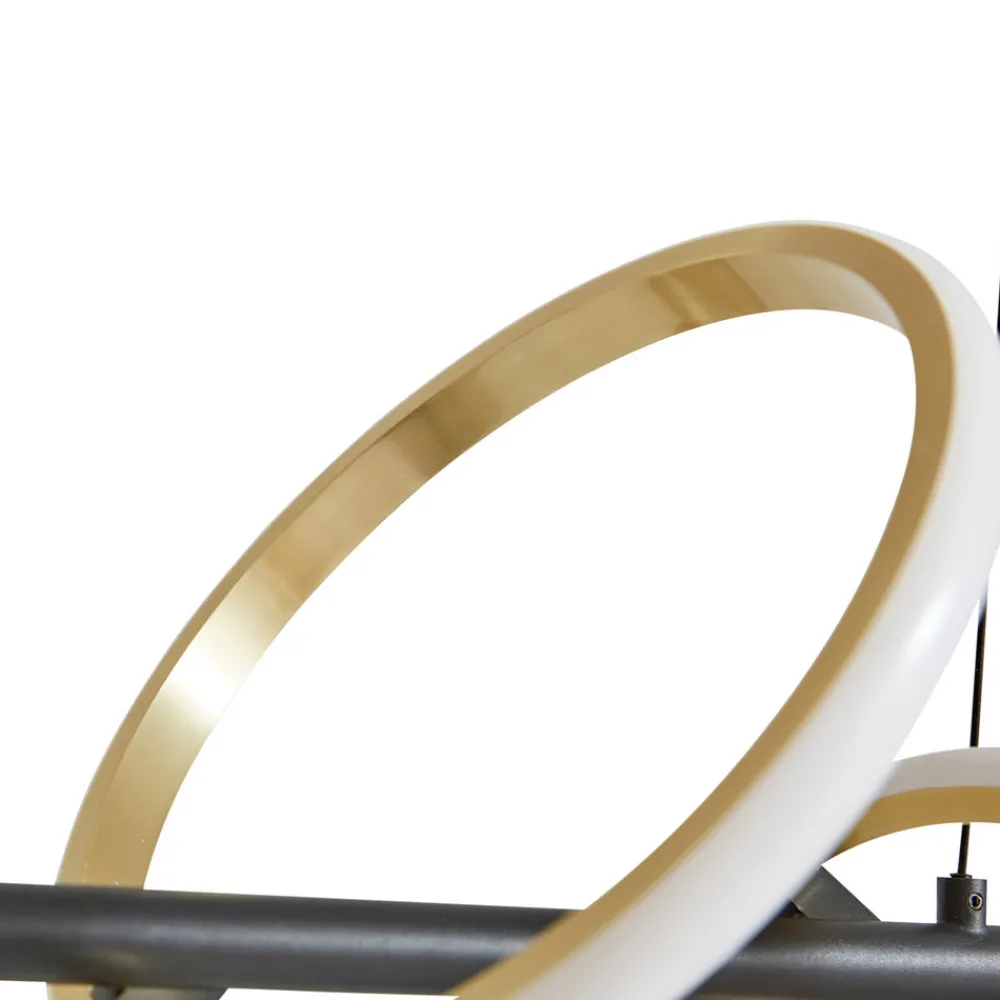 Madu LED-pendellampe med gylne lyselementer Madu LED-pendellampen med ringformede lyselementer er en moderne og energibesparende belysningsløsning for hjemmet. På en svart stang er det montert flere ringer som imponerer med sitt elegante, gylne utseende. På utsiden sitter LED-lampene under en hvit skjerm som en lysstripe og avgir et universelt hvitt lys hele veien rundt. Lyskildenes ulike plassering gir pendellampen et spennende og individuelt uttrykk, og den er spesielt attraktiv over et spisebord.