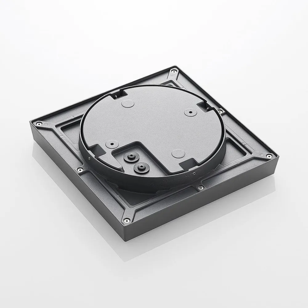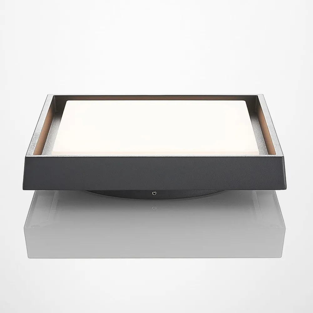 Den integrerte diffusoren i polykarbonat sørger for optimal fordeling av lyset. Diffusoren sitter i en kvadratisk ramme i aluminium som sørger for en stødig lampekropp. Utelampen er i en enkel og moderne, mørkegrå farge. Lampen bygger dessuten svært lite i høyden. Den tar derfor liten plass og føyer seg fint til taket.