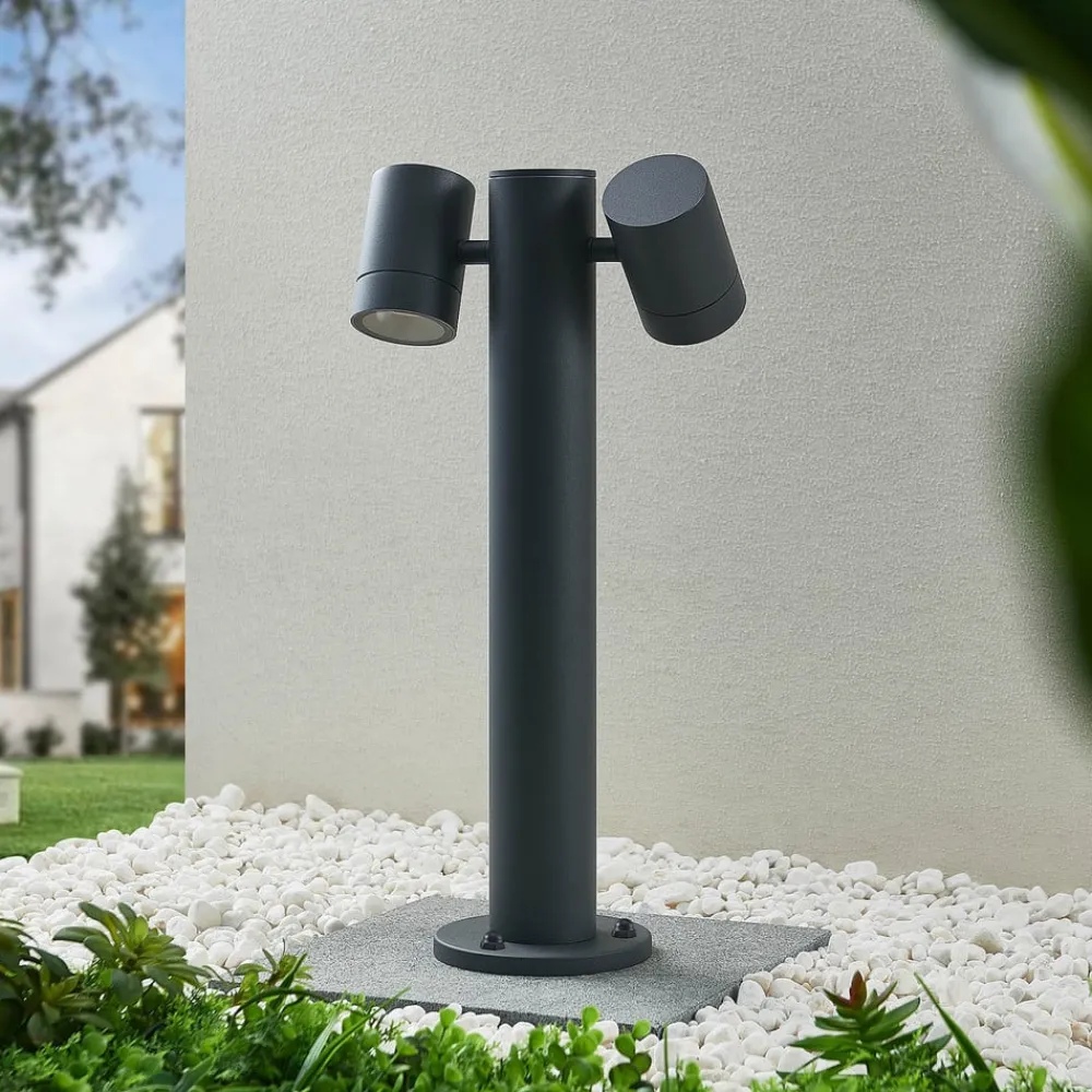 Moderne Maloney sokkellampe i aluminium i mørk grå Maloney sokkellampe i aluminium sørger for at fortauet eller hagen er perfekt opplyst, selv om natten. Den slanke sokkellampen har en subtil mørkegrå farge, og formen består av en smal sokkel og to sylindriske lampeskjermer som kan justeres fleksibelt. Disse skjermene kan utstyres med passende lyskilder og gir dermed alltid det riktige lyset. Med kapslingsgrad IP54 er sokkellampen Maloney beskyttet mot vannsprut og støv, noe som gir den en robust karakter.