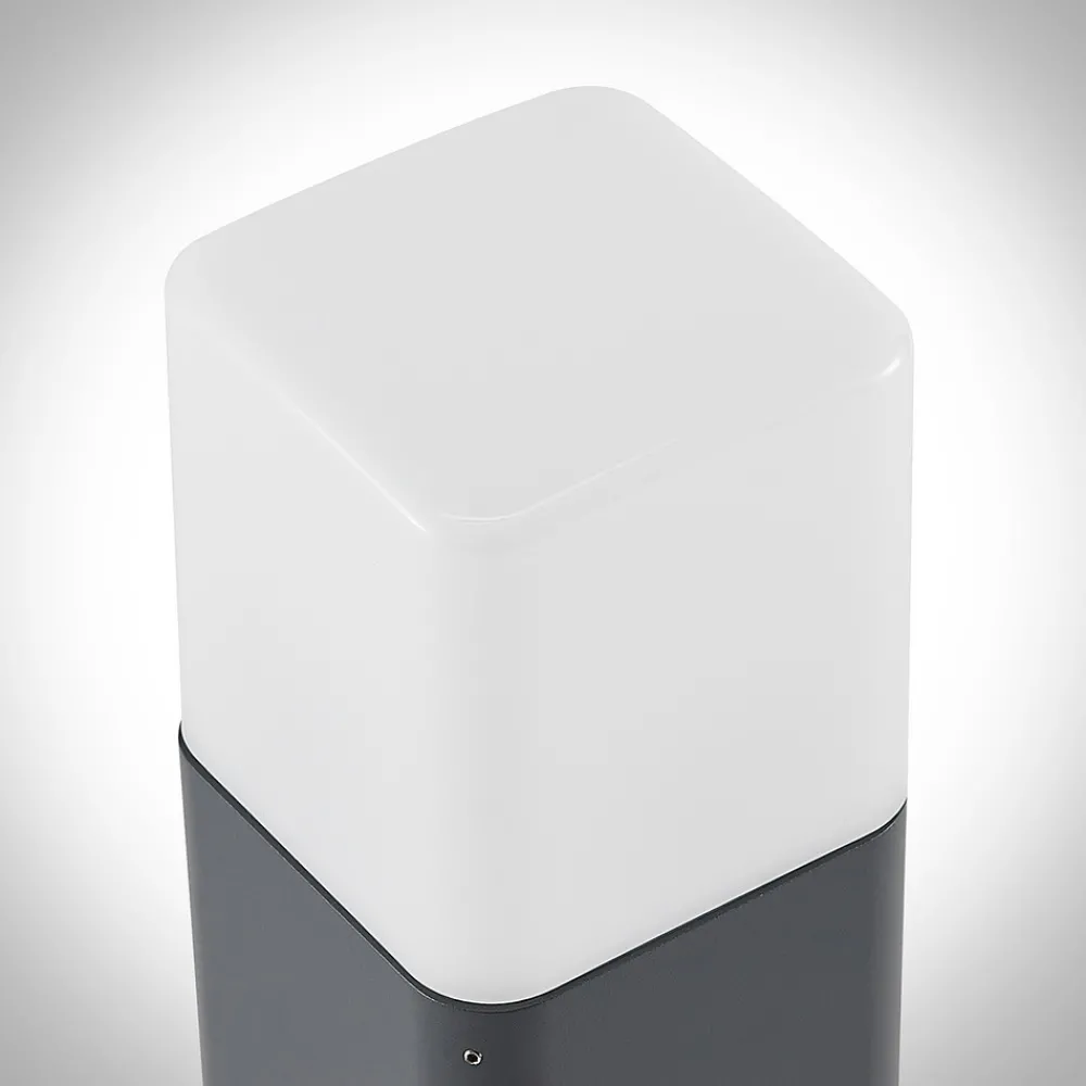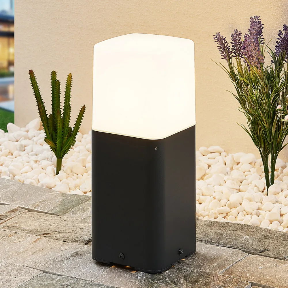Moderne utendørsbelysning – Obuna sokkellampe Den klassiske, kantete Obuna sokkellampen gir god orienteringsbelysning om kvelden og natten til alle anledninger rundt huset. Armaturens mørkegrå aluminiumskropp har en firkantet design og suppleres av en lampeskjerm i opalhvit plast. Dette sikrer at lyset blir jevnt fordelt på alle sider. Ideell til belysning av for eksempel inngangspartier eller uteplasser.