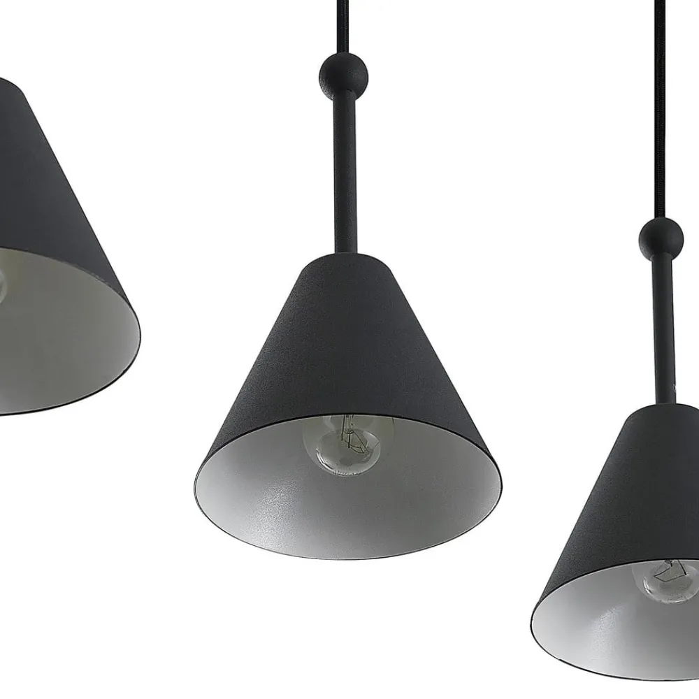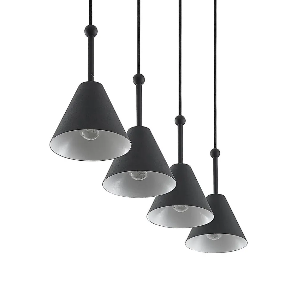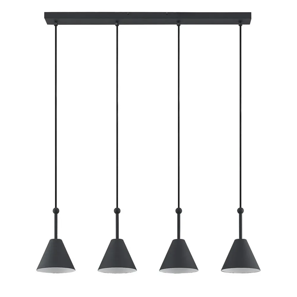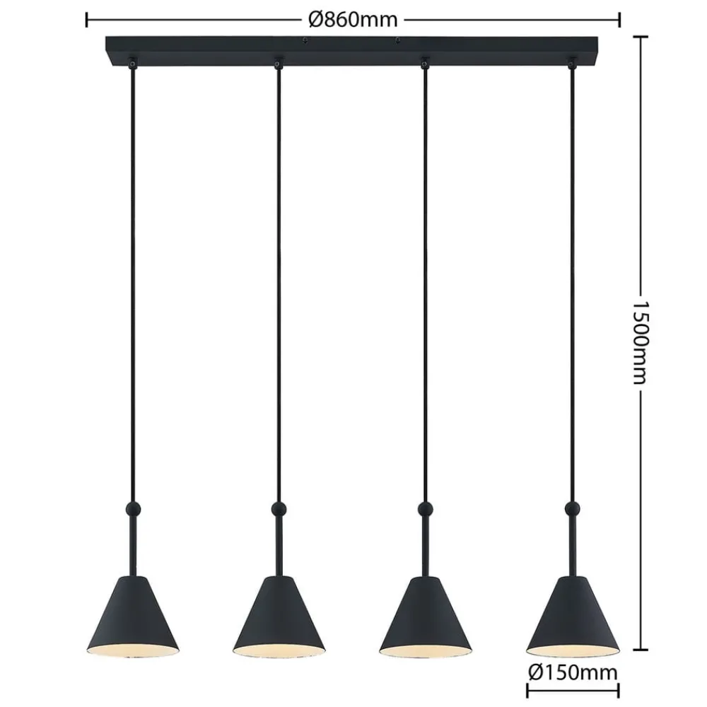 Phina-pendellampen er ideell for å belyse en stue eller spisestue. Den er laget av jern og er svart, mens det indre av lampeskjermene er hvite. Den langstrakte formen består av en langstrakt takfeste som det er festet til fire suspensjoner, hver med en lampeskjerm . Hvis du utstyrer disse med E27-lamper, skaper veggene blenderfri belysning og en harmonisk atmosfære. Med sin fasjonable design kan Phina pendellampe enkelt integreres i et bredt utvalg av innredningsstiler og setter elegante detaljer i interiøret.