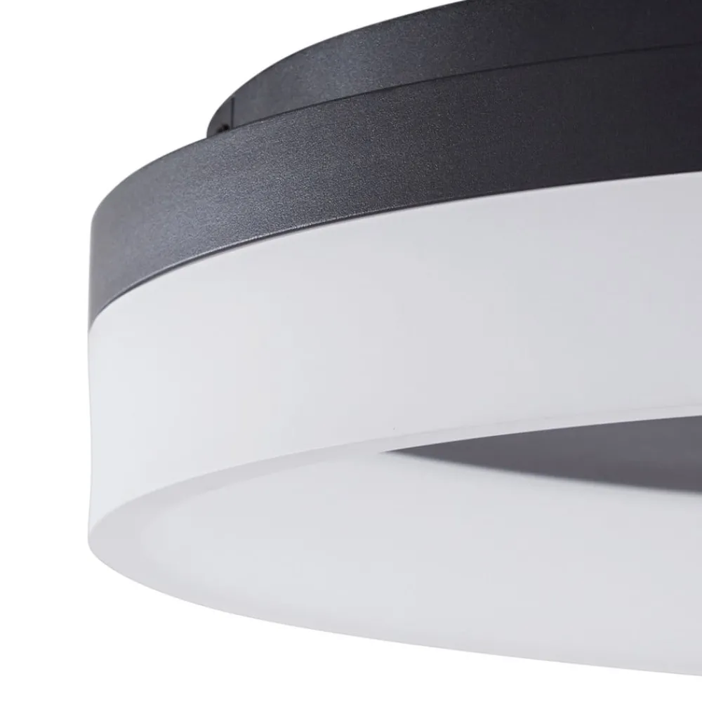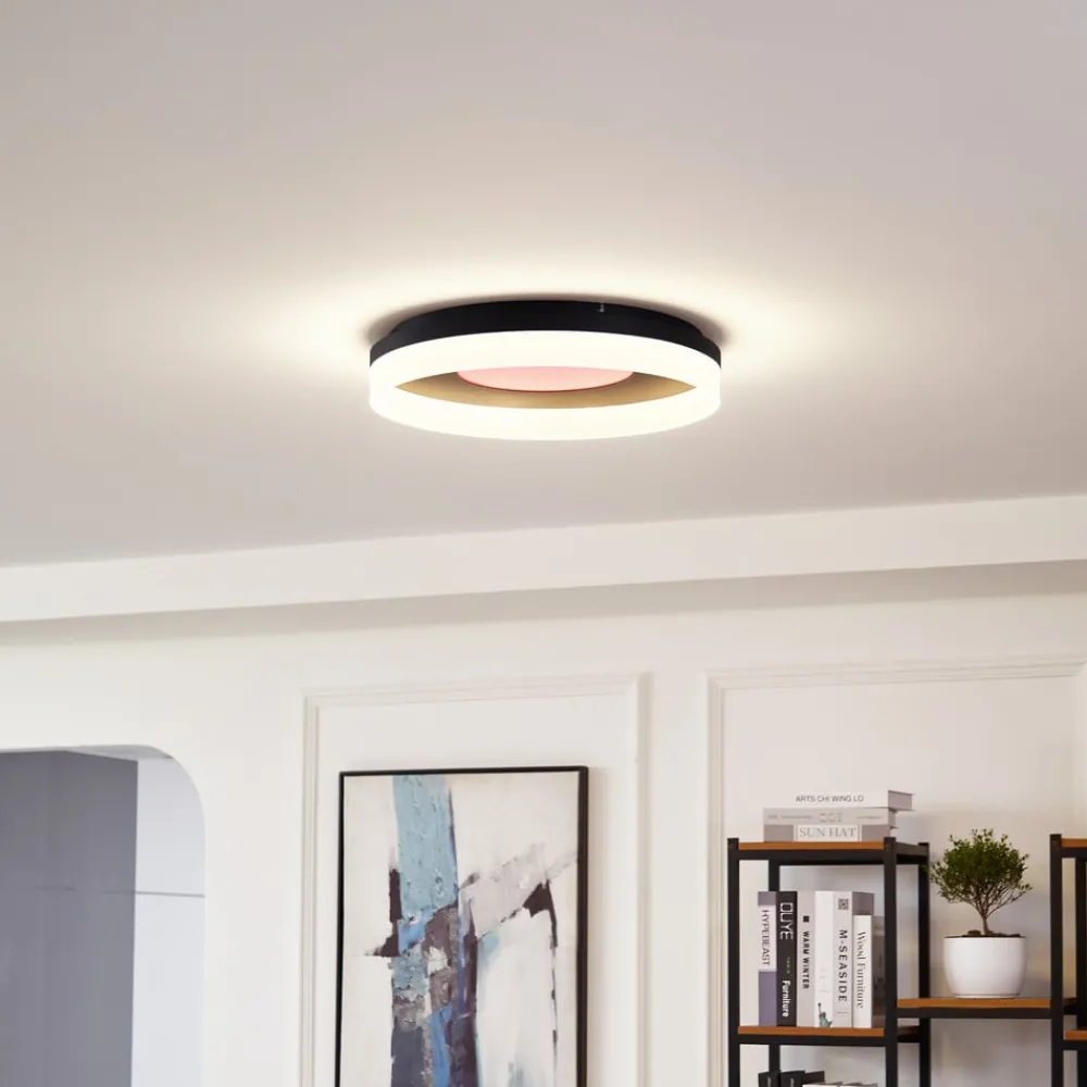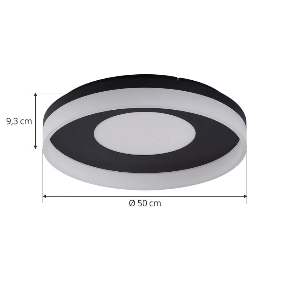 Svart LED-taklampe Squillo, smart, Tuya, med RGB-lyskilde Squillo er en smart, rund LED-taklampe som har mange funksjoner i tillegg til et moderne design. Den har to integrerte LED-moduler som kan styres på ulike måter. Hovedlyskilden kan styres i ulike lysfarger fra varmhvit til dagslys ved hjelp av fjernkontrollen eller Tuya-appen. Det er også mulig å justere lysstyrken og lage scener. Det er også mulig å skape helt skreddersydde situasjoner ved hjelp av automatiseringer og tidsplaner. I tillegg kan den sekundære lyskilden, som er plassert i midten av taklampen, lyse i mange sterke farger og skape en spesiell atmosfære.