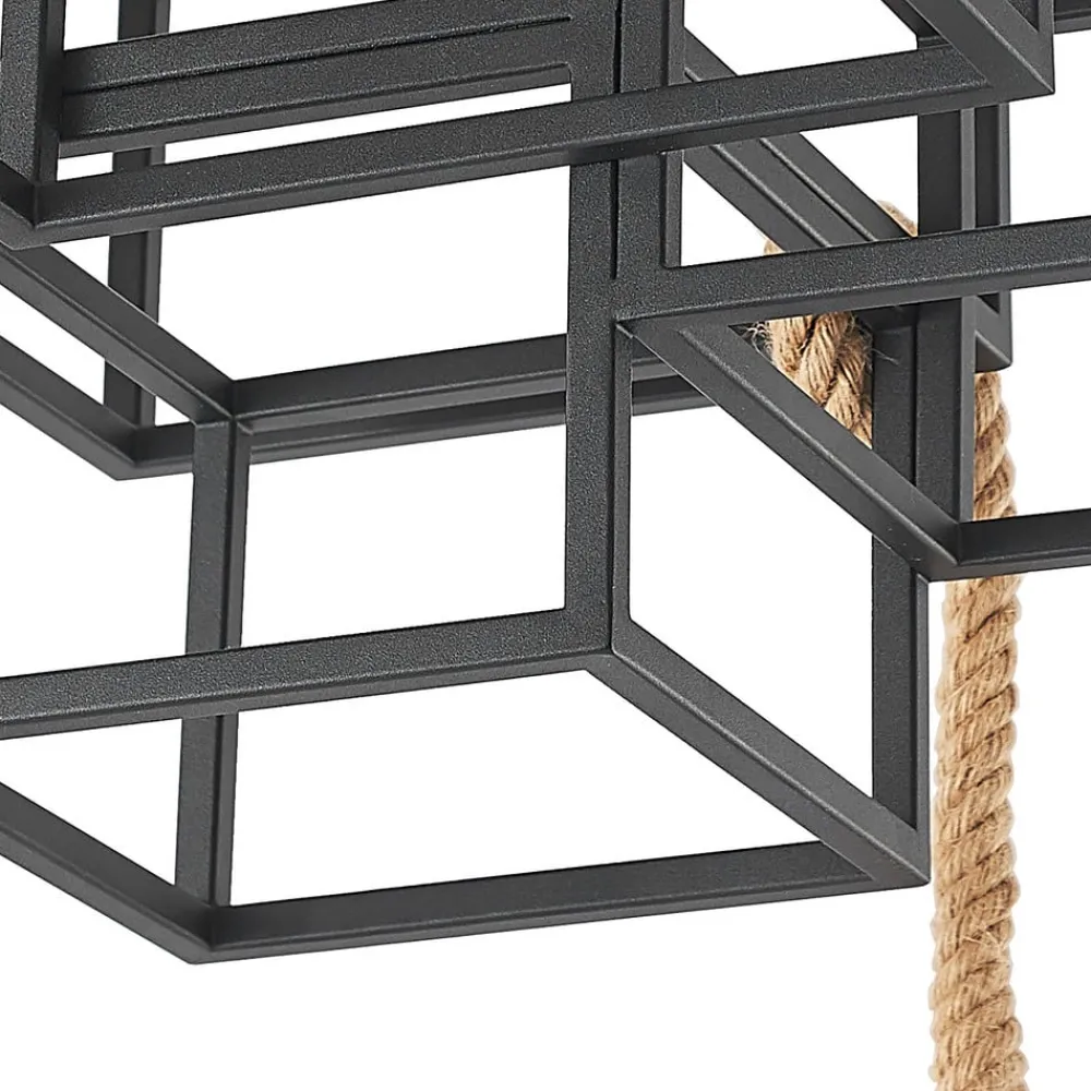 Robust Andrik taklampe i svart burlook med tauelementer Andrik er en taklampe som er en tiltalende lyskilde takket være sin robuste design. Den består av et svart stålbur som er satt sammen av ulike geometriske kubeformer. Fra det kompakte, runde takfestet går det tre kabler gjennom metallrammen og ender i åpne fatninger. Disse er egnet for E27-pærer, som kan velges etter behov. For det lille ekstra anbefaler vi å bruke pærer i dette tilfellet, da deres spesielle utseende fremhever armaturens design. Andrik taklampe forvandler ethvert rom til noe helt spesielt og sprer sin slående stil i interiøret på en effektiv måte.