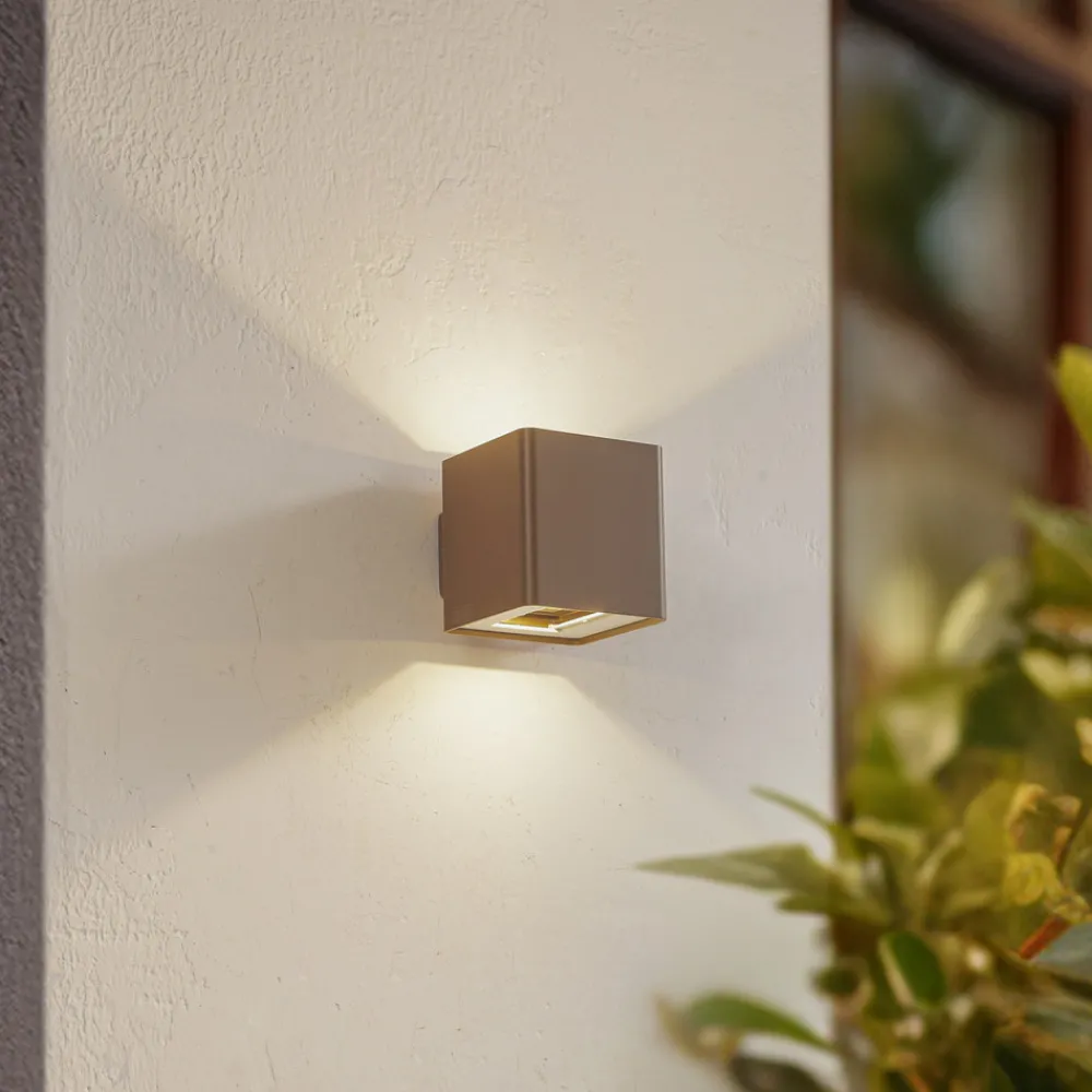 Enkel utendørs LED-vegglampe Aaron i støpt aluminium med brun farge Utendørs LED-vegglampen Aaron kombinerer moderne design med funksjonell belysning for uteområder som terrasser og balkonger. Den integrerte LED-lyskilden gir energibesparende lys, mens kapslingsgraden IP54 beskytter armaturen mot støv og vannsprut. Opp/ned-effekten skaper en innbydende atmosfære og fremhever arkitektoniske detaljer på en elegant måte. Den brune aluminiumsfinishen føyer seg harmonisk inn i omgivelsene og understreker produktets stilrene modernitet – Justerbar spredningsvinkel (30° – 130°)