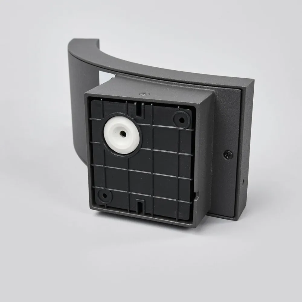 Juvia utendørs LED-vegglampe med buet skjerm Juvia passer godt inn i moderne omgivelser. Lampekroppen er laget av aluminium og har en mørkegrå lakkering som gir den et tidløst utseende. Den utendørs LED-vegglampen har også god energieffektivitet, og den hvite skjermen sørger for en myk fordeling av lyset. Den buede formen sørger for at lyset rettes mer mot bakken.