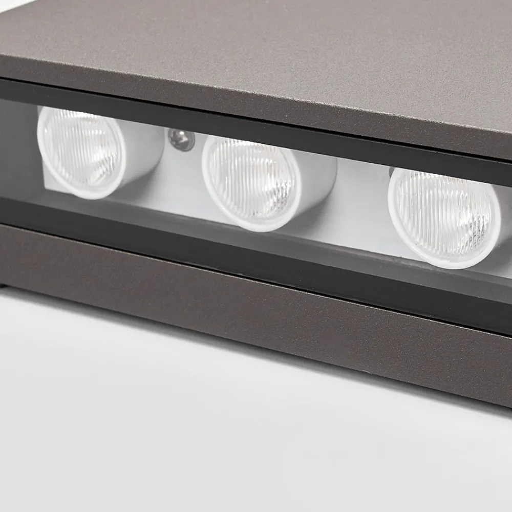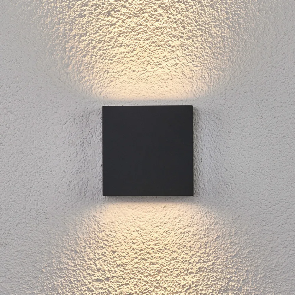 Kvadratisk LED utendørs-vegglampe Trixy i grafittgrålakkert aluminium Trixy er en utendørs LED-vegglampe med et svært tidløst design, som kun består av en mørkegrå aluminiumskropp i en kantet form. Den er utstyrt med 6 høykvalitets LED-lamper fra Cree, hvorav tre er plassert øverst og tre nederst. Lyset virker svært imponerende selv på avstand når det skinner oppover og nedover og skaper et imponerende lysbilde på veggen bak. Den nøkterne, puristiske formen passer selvfølgelig godt til moderne omgivelser, men det er heller ingenting i veien for at utendørs LED-vegglampen kan kombineres med klassiske eller til og med historiske bygninger.