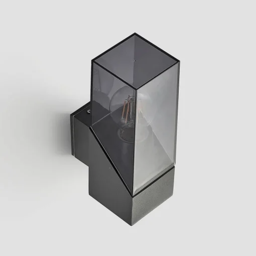 Moderne utendørs vegglampe Fiola med dekorativt utseende Den moderne vegglampen Fiola gir godt og tilstrekkelig sterkt lys til uteområder. Den kan for eksempel brukes rundt inngangsdøren, kjellertrappen, på balkongen eller i hageskuret, dvs. overalt der det er behov for lys på kveldstid for bedre orientering og sikkerhet. Fiola utelampe er laget av mørkegrå aluminium, som er smart kombinert med en gjennomsiktig, litt røykgrå skjerm av plast. Pæren, som her er vist åpen, er ideelt sett en dekorativ filamentpære eller retrofit-pære.