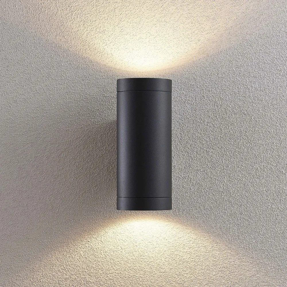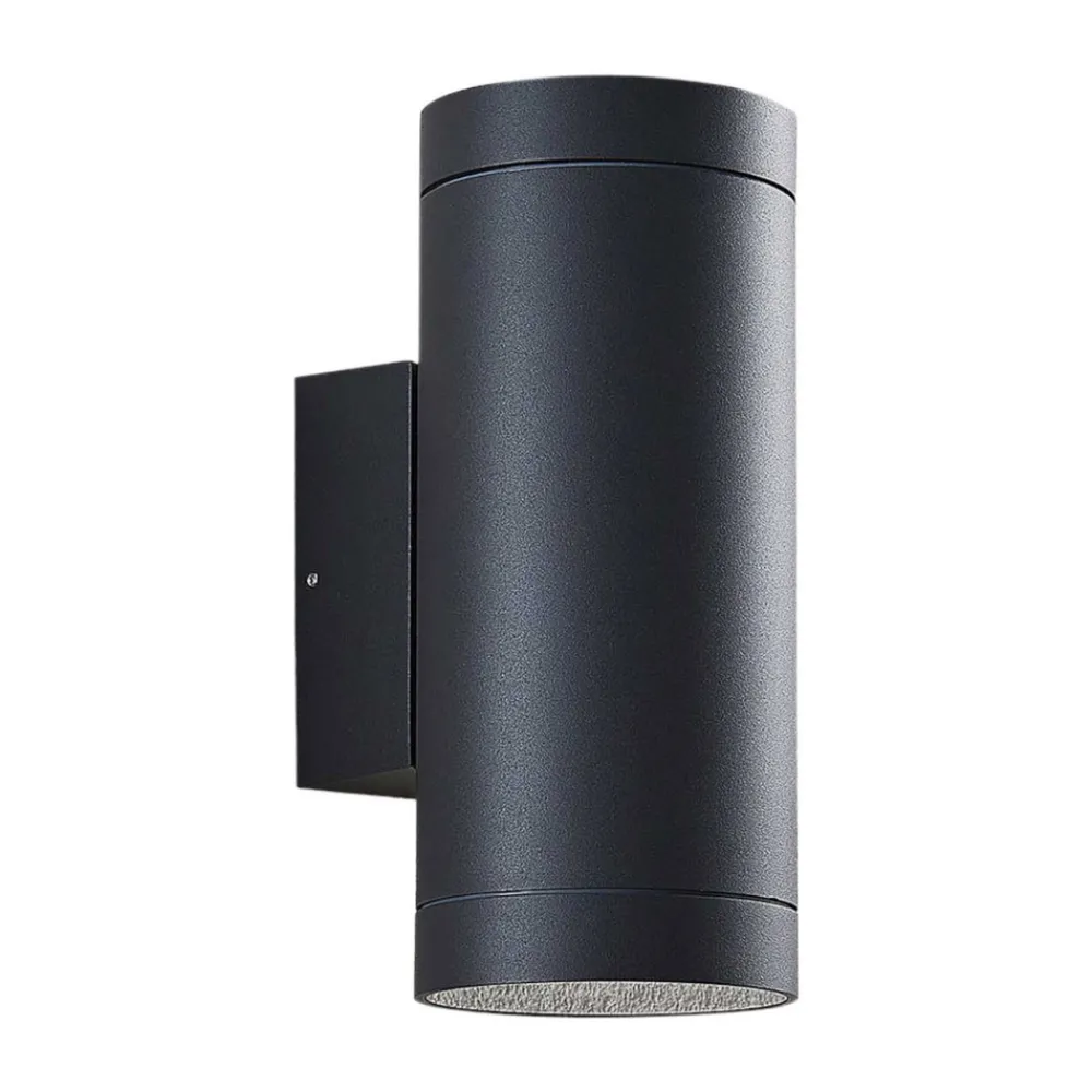 Sylindrisk utendørs vegglampe Thomke med mørkegrå finish, IP65 Denne utendørs vegglampen imponerer med sine 2 lyskilder og lysutslipp oppover og nedover. Den ser svært effektfull ut utendørs, selv på avstand. Konvensjonelle E27-pærer kan brukes, fortrinnsvis med effektiv LED-teknologi. Lampekroppen er laget av trykkstøpt aluminium og har en mørkegrå overflate, som i likhet med den sylindriske formen er så tidløs at armaturen er spesielt allsidig. Den høye kapslingsgraden gir optimal beskyttelse mot fukt og smuss – IK06 slagfasthetsklasse – Mulighet for gjennomgående kabling