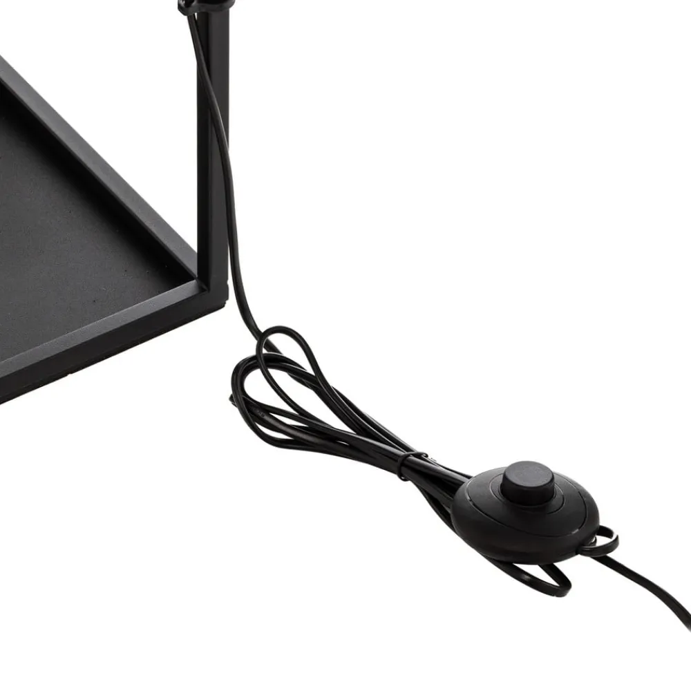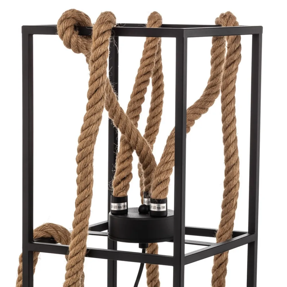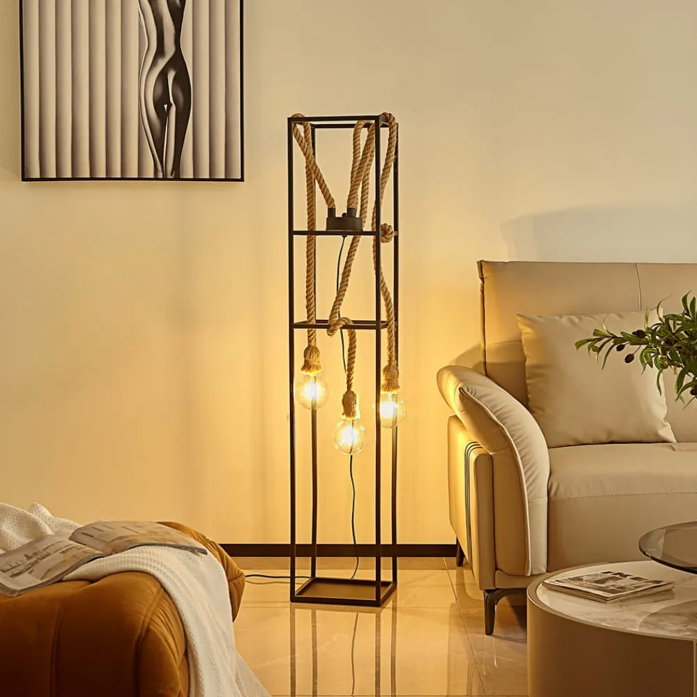 Kantet, rammeformet Vlados gulvlampe laget av jern med tre hampetau Vlados gulvlampe skiller seg utvilsomt ut i stuen med sin uvanlige og unike design. Den består av et slags bur eller ramme laget av svart stål og orientert vertikalt. Fra strømuttaket til fatningene er det festet hampetau som skaper en slående kontrast til metallrammen med sin svarte overflate. Tauene kan vikles rundt rammen etter eget ønske, noe som selvsagt også gjør det mulig å skape et mer individuelt uttrykk. Selve pærene spiller også en stor rolle for uttrykket og bør derfor velges slik at de passer sammen og helst ha en glasspære, slik tilfellet er med de klassiske glødepærene, som i dag i stor grad erstattes av LED-pærer fordi de ser like ut, men er mye mer effektive.