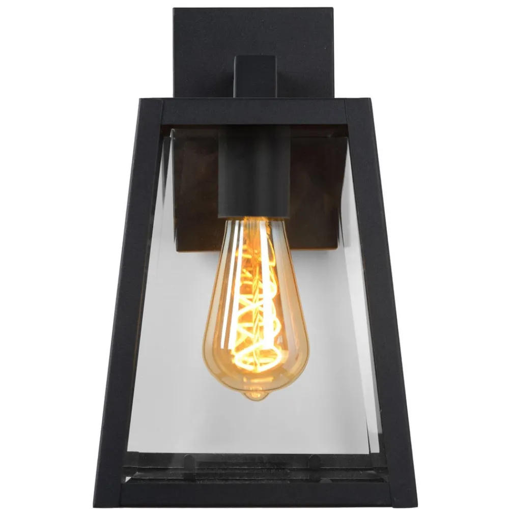 Matslot utendørs vegglampe i mattsvart metall og klart glass Matslot utendørs vegglampe passer like godt på fasaden til rustikke bygninger som på veggen til et hus på landet eller en moderne bygning, siden den er laget av mattsvart metall og klart glass i et svært enkelt design. Både veggfestet og skjermen, som blir litt bredere mot bunnen og er utstyrt med klare glassruter med vakkert fasede kanter, har en kantet form. Den henger fra veggbraketten på en liten brakett som peker nedover, og det klare glasset i skjermen avslører lyskilden. For å oppnå en optisk effekt som den avbildede modellen anbefaler vi å bruke en LED-pære med glødetråd i pæreform eller rustikk form. Lyskilden følger ikke med.