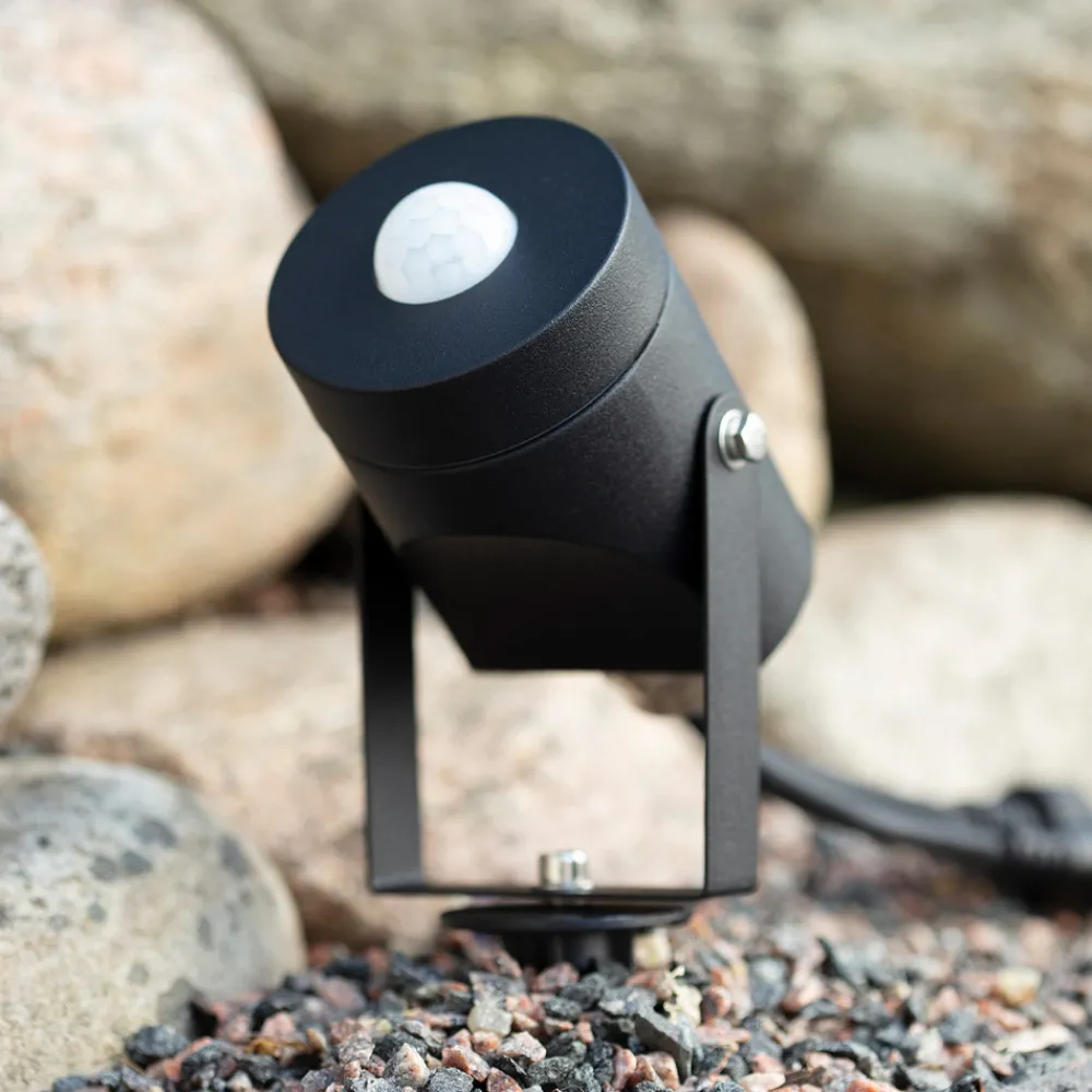 Lys når du trenger det – med bevegelsessensoren i Garden 24V-systemet Denne svarte bevegelsessensoren er utformet som en utendørs spot og har en spot der sensoren er plassert, som kan flyttes og justeres takket være monteringen. Dette betyr at det ønskede området alltid blir optimalt detektert. PIR-sensoren kan plasseres fleksibelt takket være jordspydet. Når det registreres bevegelse, sørger den for at alle tilkoblede lamper i Garden 24V-systemet slås på og også slås av igjen når det ikke er mer bevegelse. Den er derfor ideell for innkjørsler eller inngangspartier – 120° registreringsvinkel – 7 m registreringsrekkevidde – Slår seg automatisk av etter 2 minutters belysning – Fungerer bare sammen med andre komponenter i Garden 24V-systemet fra Markslöjd