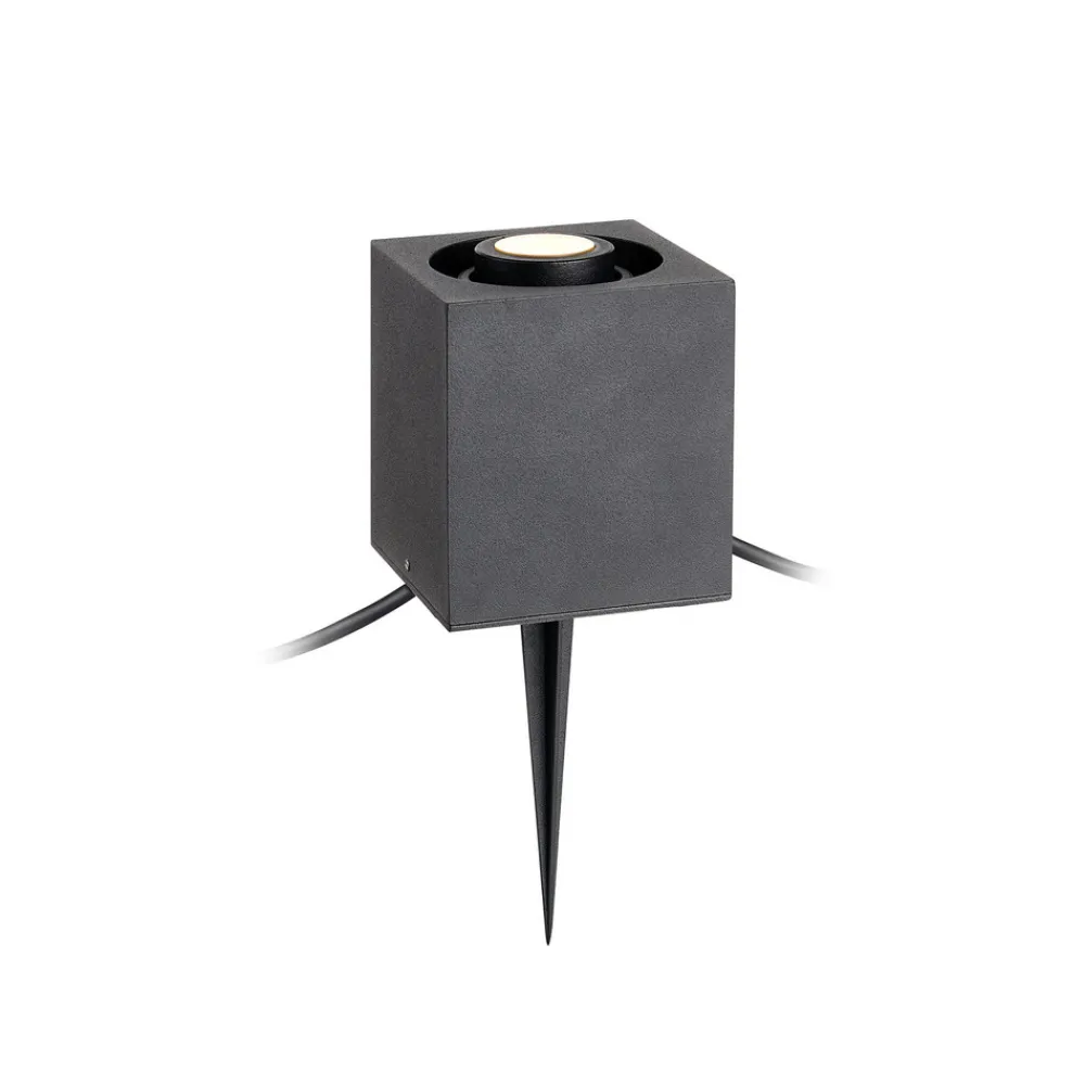 Kubformet LED-dekorasjonsbelysning Cube Spot med bevegelig lyskilde Cube Spot er en LED-spot til utendørs bruk som er formet som en kube og har en enkel design. Den er laget av aluminium og er helt svart. En spot med varmhvite LED-spoter er innfelt i toppen og kan flyttes, slik at spot-lyset kan rettes. Jordspydet gjør det enkelt og fleksibelt å forankre den i bakken. Takket være den integrerte inngangs- og utgangskabelen kan dekorasjonsbelysningen enkelt kobles til andre komponenter i Garden 24V-systemet – ekstra komponenter som en passende transformator er nødvendig for idriftsettelse (se tilbehør)
