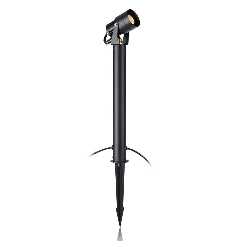 Spotlight LED-spot med jordspyd for målrettet belysning av utendørsobjekter Garden 24V-systemet fra Markslöjd er et praktisk system for utendørs bruk som kan kobles sammen med en rekke armaturer og komponenter, og som har noe for ethvert behov i sitt sortiment. Installert sammen på en enkel måte resulterer dette i et harmonisk belysningssystem, som inkluderer denne spot med jordspyd. Spotlight-spotlighten gir et direkte, punktvis lys som kan brukes til å fremheve trær eller gjenstander på en elegant måte. Den slanke, svarte aluminiumskroppen smelter diskret inn i omgivelsene og er beskyttet mot vær og vind takket være IP44-klassifiseringen. Jordspydet gjør at lampen kan plasseres fleksibelt i mykt underlag. Den innebygde spoten kan flyttes for å oppnå optimal justering – ekstra komponenter som f.eks. en passende transformator er nødvendig for idriftsettelse (se tilbehør)