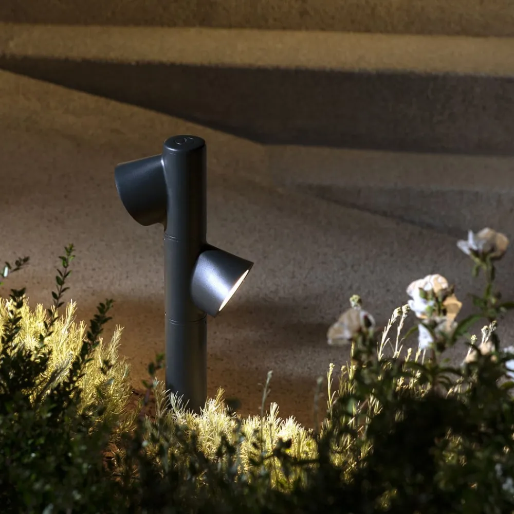 Bruco LED-gatelampe banelys med sin sylindriske aluminiumsdel i mørk antrasitt ser moderne ut og gjennom. De to runde lysuttakene er integrert i det øvre området av sylinderen, som kan roteres individuelt under installasjonen – i felles retning eller i motsatt retning. LED-lampene er bak deksler laget av opal polykarbonat, som sikrer et bredt og diffust utslipp av varmt hvitt lys.