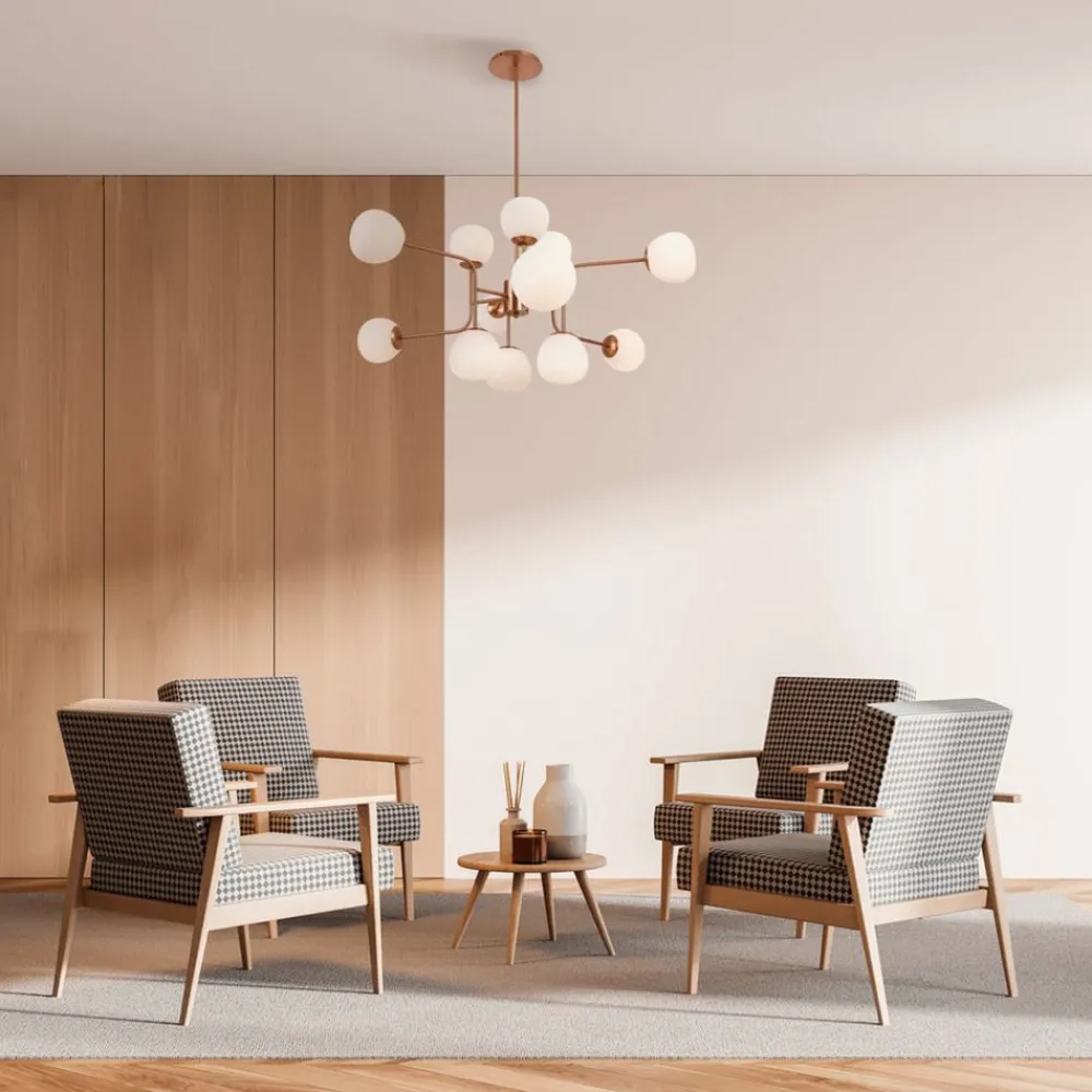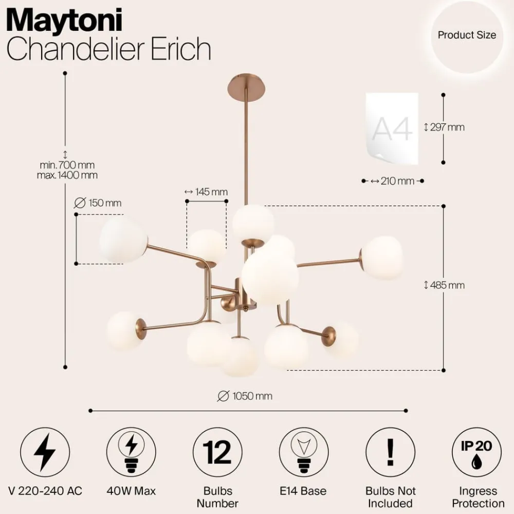 Maytoni lysekrone Erich, messing roséglass/metall, 12 lyskilder.