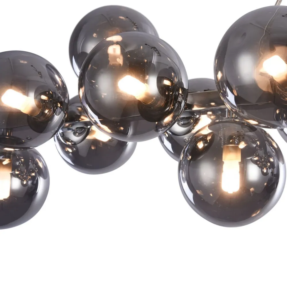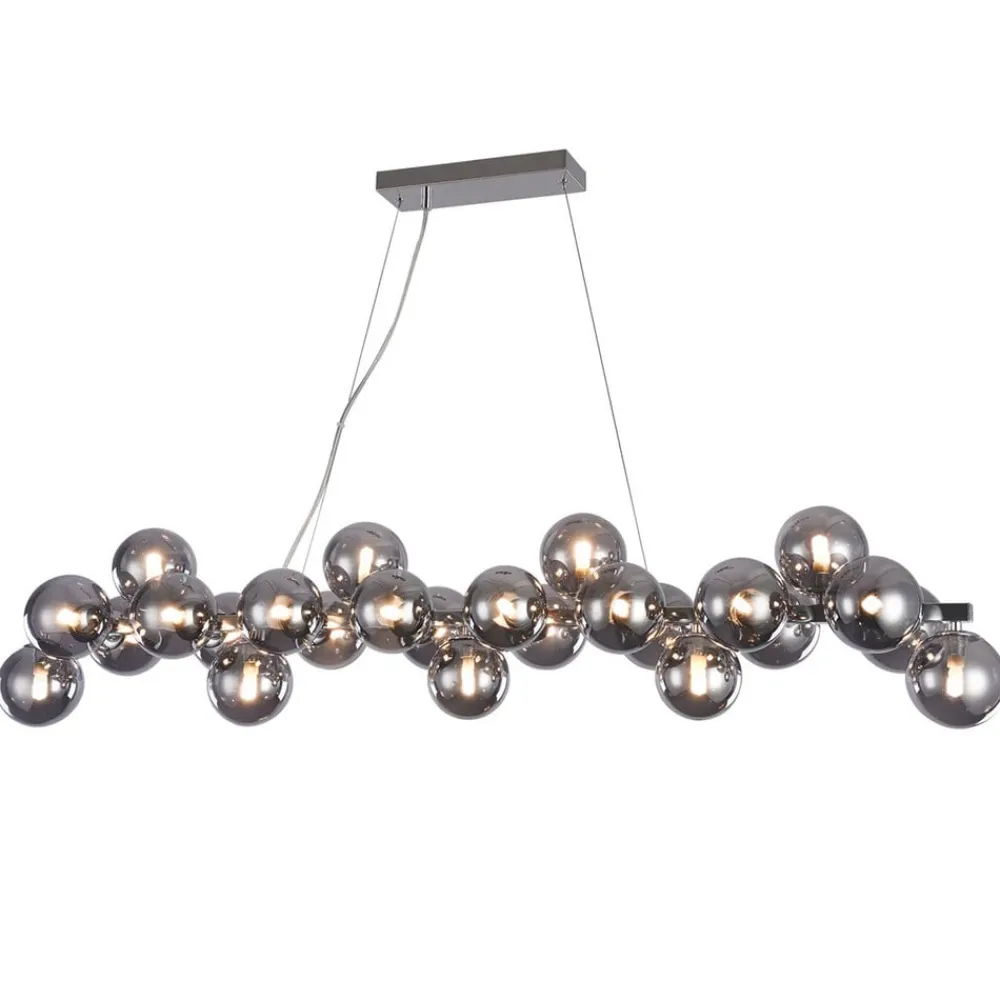 Dallas pendellampe med kromfargede sfæriske glassDen 25-flammers Dallas pendellampen fremstår som en drøm: Den langstrakte skjermen består av sfæriske, kromfargede glass som er festet til en lang metallstang. Den komplette armaturen ser moderne og samtidig veldig festlig ut, ettersom de opplyste glassene stråler ut et spesielt briljant lys på grunn av fargen. En iøynefallende grunn- og områdebelysning for den moderne stuen, som gir hvert rom en spesiell eksklusivitet.