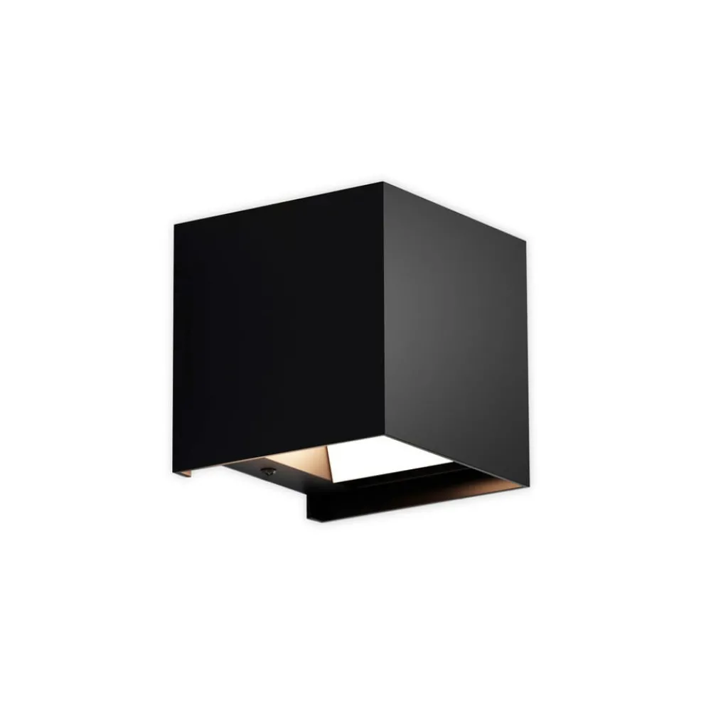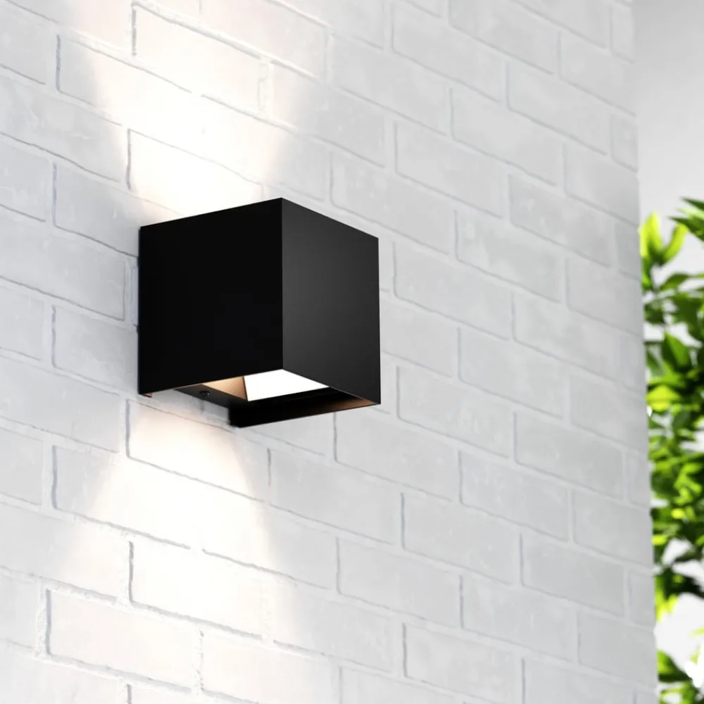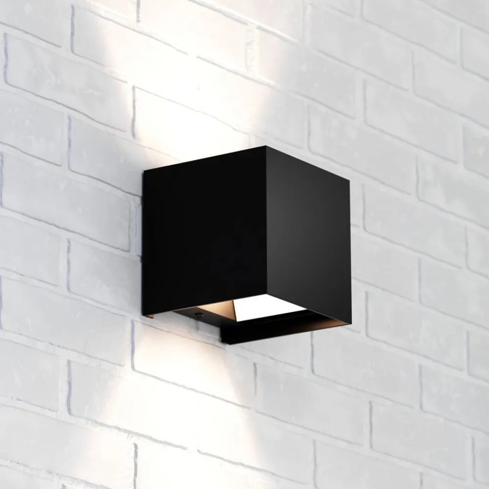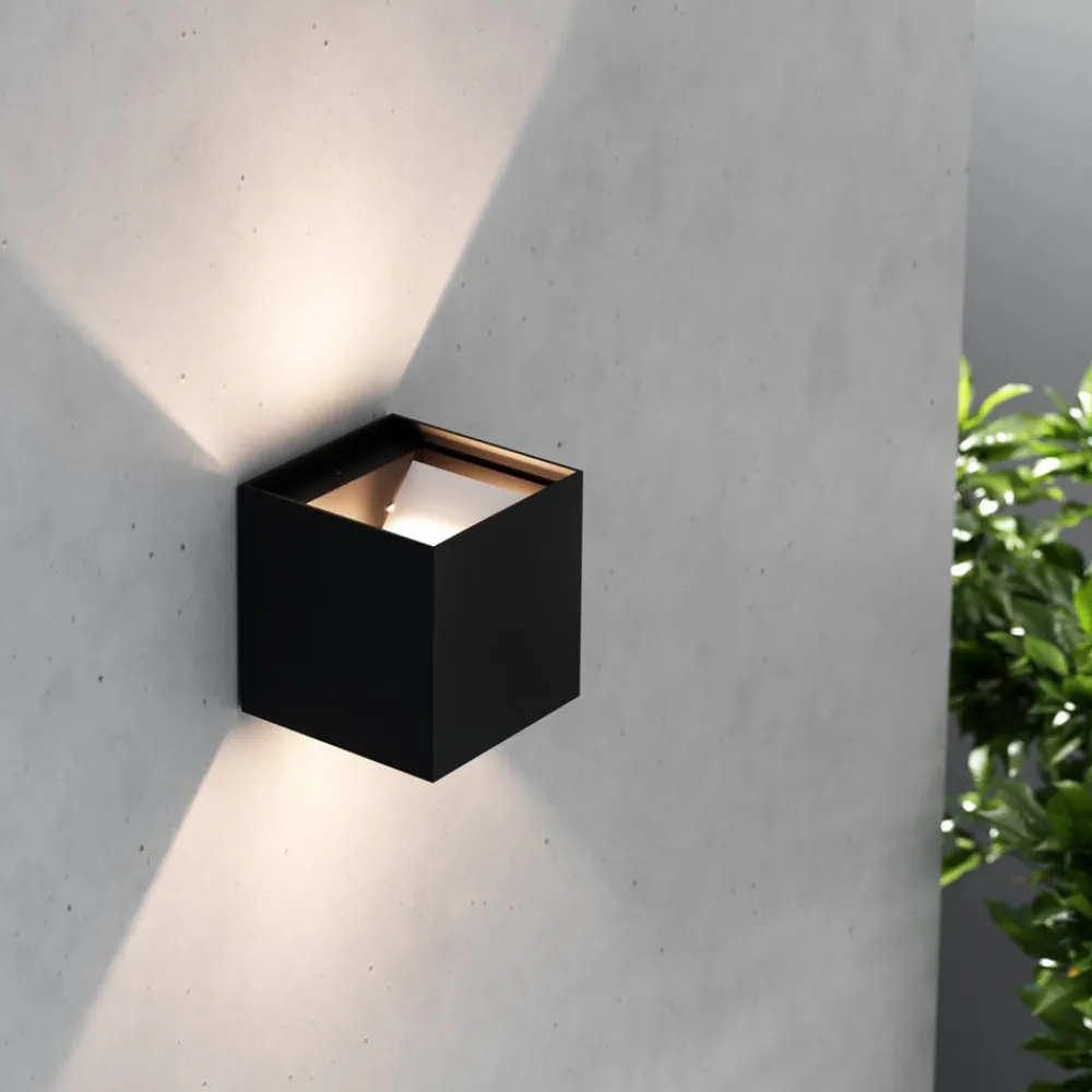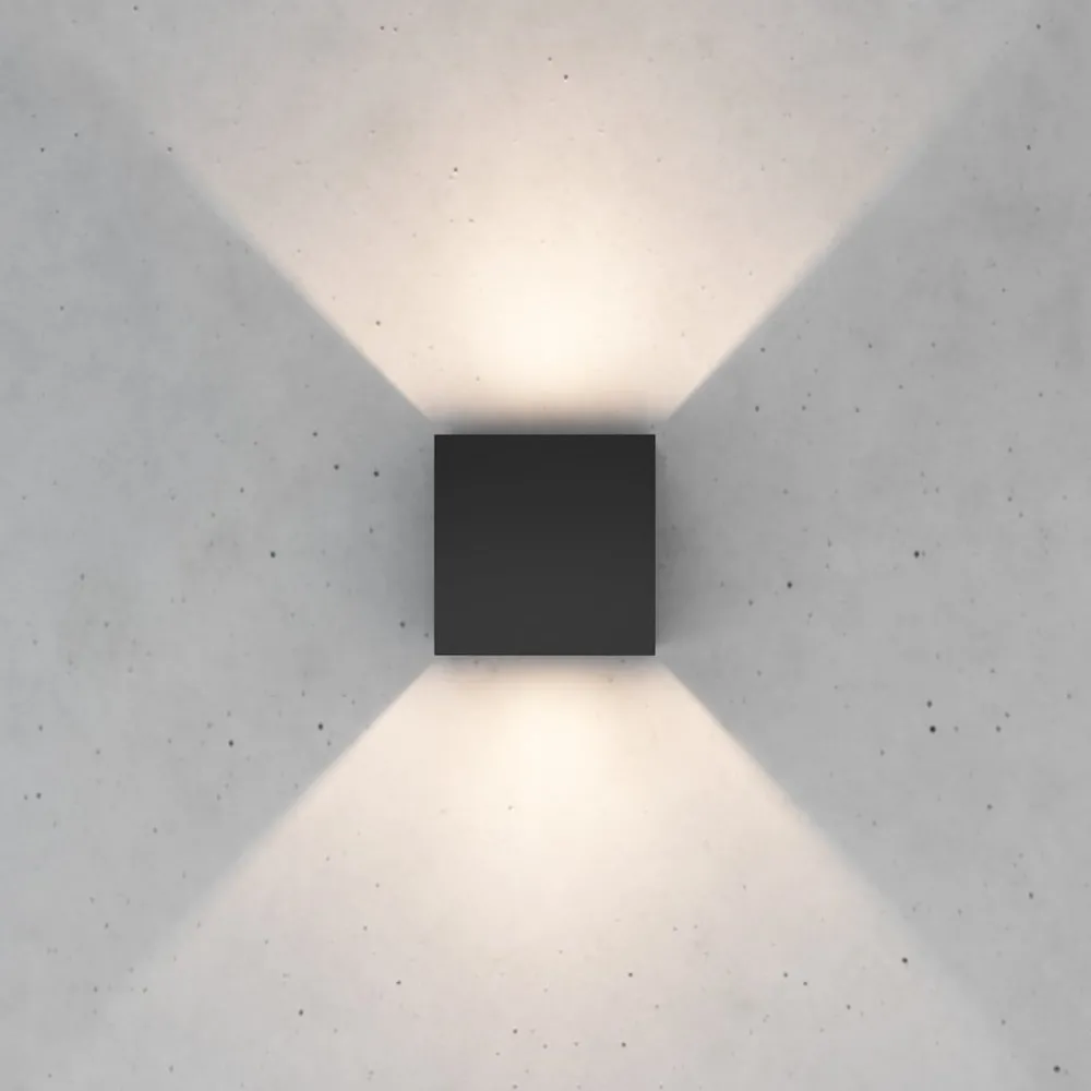 Kubeformet Zuza 2 vegglampe, fordeling i topp og bunn Zuza 2 vegglampe, laget av metall i en enkel kubeform, er utstyrt med en G9 fatning inne i kroppen. Lyset fra pæren som skal brukes, sendes ut gjennom åpningene øverst og nederst, med fire hengslede vinger som gjør det mulig å justere strålevinkelen individuelt.