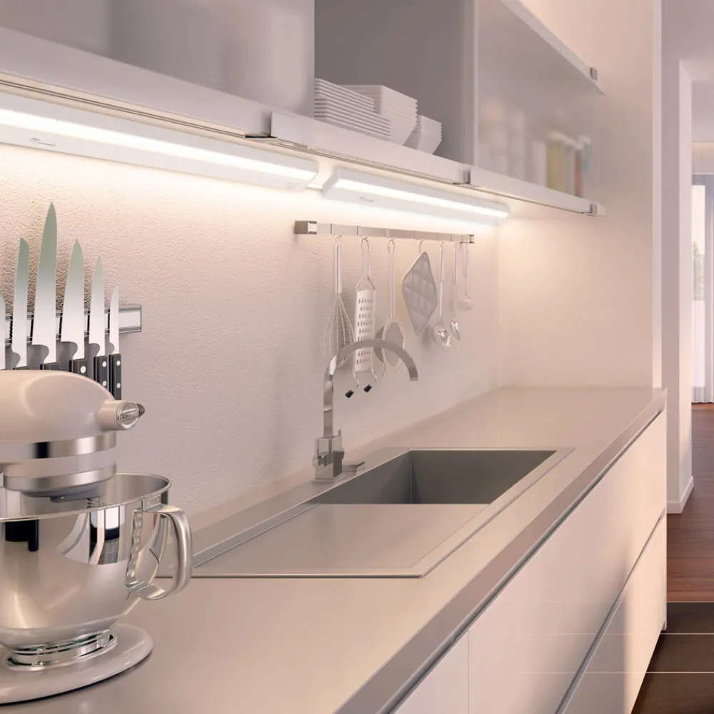 Med dimmer – Cabinet Light Dim LED underskapslampe Med Cabinet Light Dim LED underskapslampe på arbeidsflaten oppnår du ikke bare et sterkt, universelt hvitt arbeidslys, men også en koselig og stemningsfull dekorasjons- eller orienteringsbelysning på kjøkkenet. Cabinet Light Dim underskapslampe er nemlig utstyrt med en dimmer i tillegg til bryteren, slik at lysstyrken enkelt kan reguleres på lampen. Leveransen inkluderer en 180 cm lang tilkoblingskabel med støpsel samt en tilkoblingskabel med støpsel for sammenkobling av to lamper.