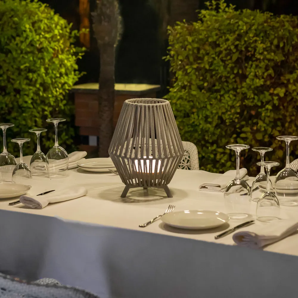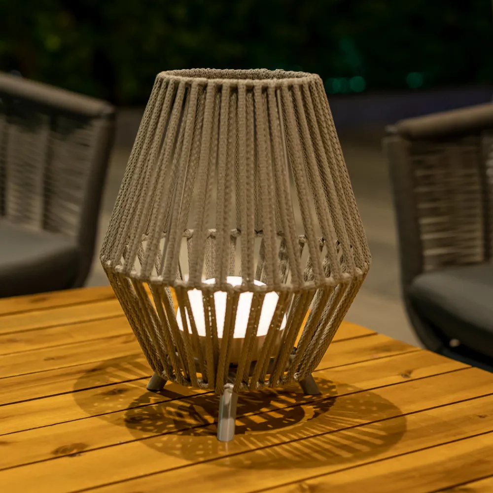Taupefarget Conta LED-bordlampe med oppladbart batteri Denne vakre bordlampen med burlignende skjerm kan brukes både innendørs og utendørs takket være IP54-klassifiseringen. Den trebente bordlampens kropp er laget av resirkulert PVC og er spesielt robust mot vær og vind. Conta er utstyrt med et oppladbart batteri og en USB-port for praktisk batterilading. Du trenger også en ladekabel og en plug-in-strømforsyningsenhet (ikke inkludert). Conta leveres med en bærbar LED-lampe som ikke trenger å monteres. Den fester seg takket være den magnetiske sokkelen og slås av og på og dimmes ved hjelp av den medfølgende fjernkontrollen.