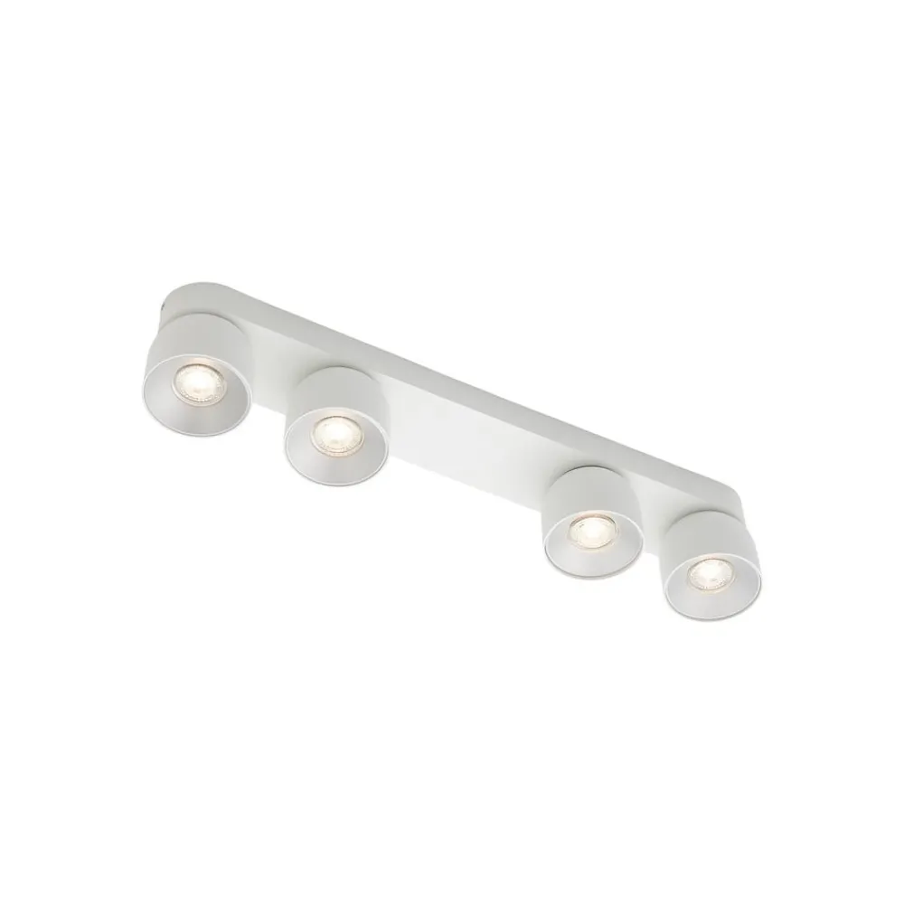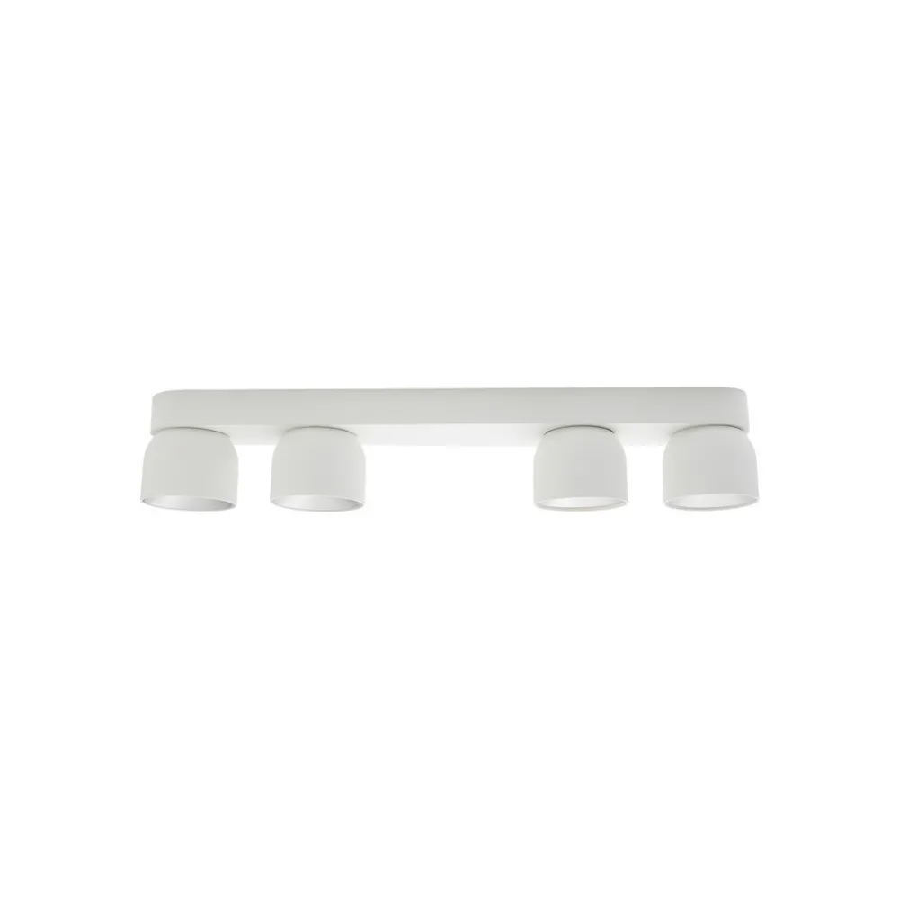 Pitcher taklampe med fire lys og vippbare skjermer Den lange taklampen Pitcher, som har fire lyshoder som kan svinges ved hjelp av et skjult vippbart hengsel, er laget av metall og har en glatt, avrundet design. De fire downlightsene, som sitter på den lange baldakinen, kan svinges i ulike retninger for å belyse ulike deler av rommet – for eksempel på kjøkkenet eller i en lang gang.