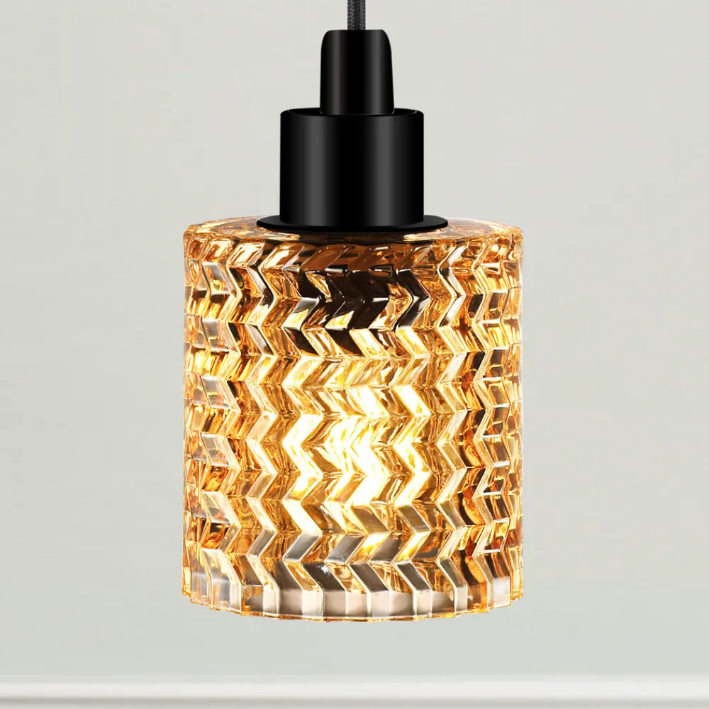 Den sylindriske skjerm til Hollywood-hengelyset er laget av gjennomsiktig glass med en mangesidig design. Den elegante lampen i retro-design er perfekt for å belyse små bord, men en kombinasjon av flere lamper – montert på rad eller i en sirkel – er ideell for å belyse en teller eller et større område. Kombinasjonen av ulik tonede eksemplarer fra Hollywood-serien er spesielt dekorativ.