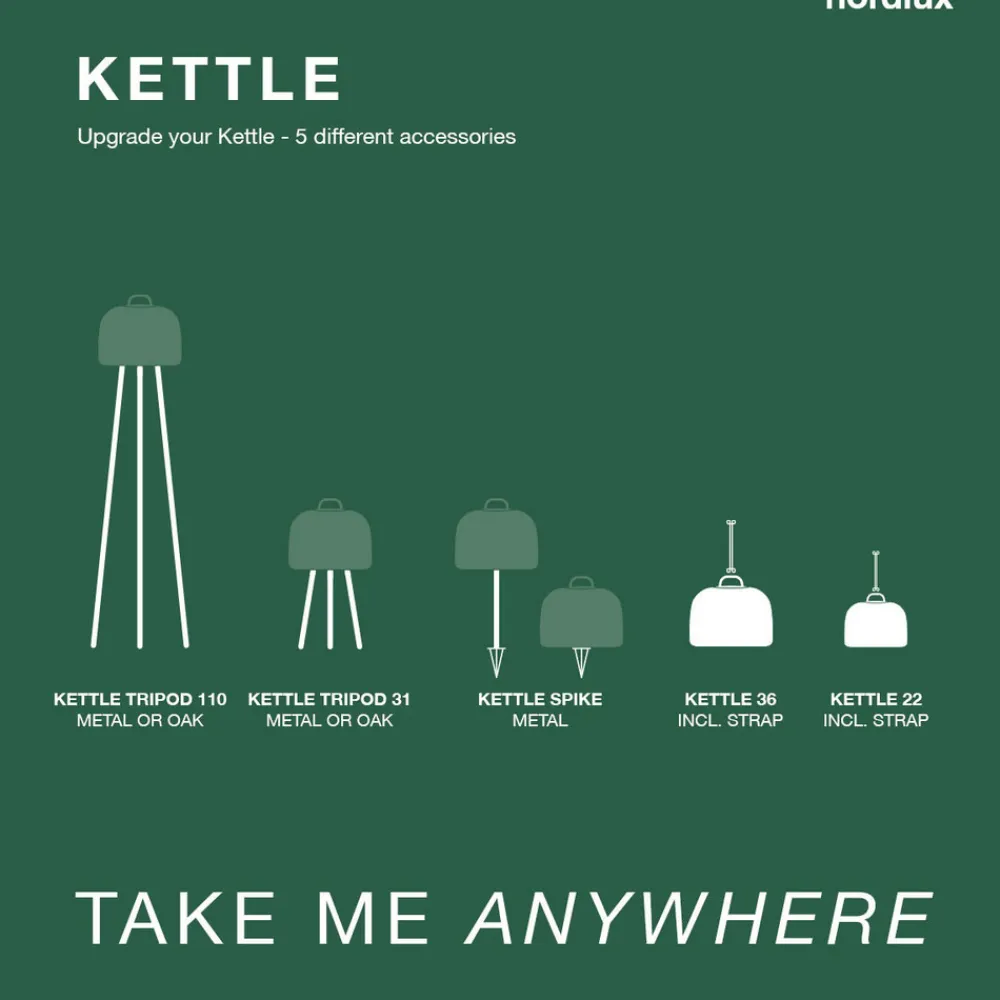 Et dekorativt utseende, praktiske funksjoner og en unik design skiller LED-lampe med jordspydet Kettle ut, med design fra det danske designstudioet Says Who. Lampen består av et jordspyd for montering og en polyetylenskjerm, utstyrt med håndtak på toppen, og varmhvite LED-lys på innsiden. Takket være det integrerte batteriet kan det brukes hvor som helst og krever strømtilkobling bare for å lade med kabelen for mikro-USB-lading. Med det integrerte tretrinns Moodmaker™-systemet kan LED-lysene stilles inn i tre trinn og enkelt gjennom flere bryterfaser. Avhengig av lysstyrkeinnstillingen er lystiden for 100 % batteri opptil 5 timer, 60 % opptil 10 timer og 30 % opptil 15 timer.