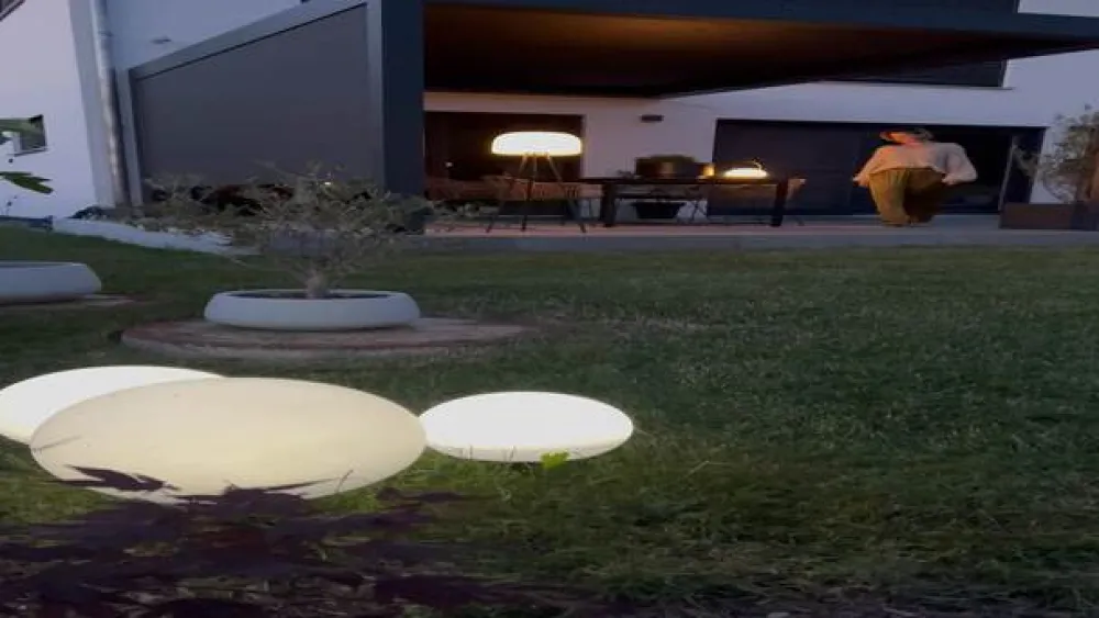 Hjemmets terrasse eller balkong, samt gastronomiske uteområder eller utenfor andre forretningssteder kan fortrylles med LED-gulvlampen Kettle tripod uten strømforbindelse, siden lampen er utstyrt med et oppladbart batteri og ladekabelen følger med. De varmhvite LED-lysene som er installert på den hvite plastskjermen, kan byttes til tre lysstyrkenivåer ved å aktivere den flere ganger for å justere et sterkere eller mer subtilt lys, avhengig av stemningen. Når batteriet er fulladet, varer lyset ved 100 % batter i fem timer, med en lysstyrke på 60 % i opptil 10 timer og 30 % i opptil 15 timer.