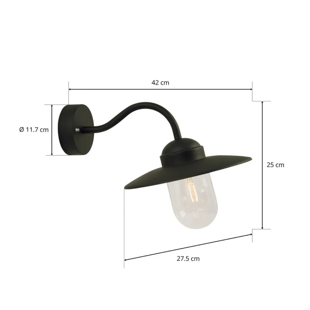 Denne vakre utendørs vegglampen minner om tidligere tider. Ved det klare glasset kan den lyse opp store områder ute. Ved skjermens hvite innside blir lyset reflektert.