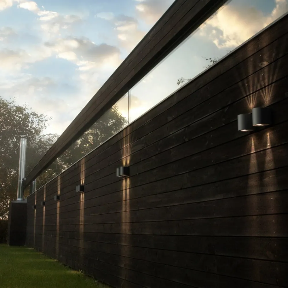 Canto 2 rund LED-vegglampe for utendørs bruk Canto 2 LED-vegglampe for utendørs bruk er formet som en kuboid med en avrundet front som minner om en sylinder. Den sprøytestøpte aluminiumskroppen har runde åpninger i toppen og bunnen, som er dekket av klart glass. LED-lampene bak dem avgir varmhvitt lys med en strålevinkel på 120° som lyser opp og ned på uteområdet. De medfølgende malene gjør det også mulig å skape dekorative aksenter på veggen ved hjelp av spesialdesignede lysmønstre – flere lamper kan kobles sammen parallelt