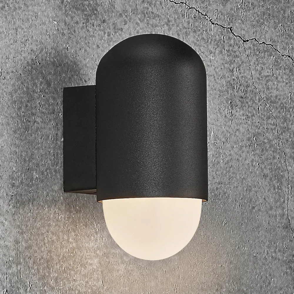 Avrundet Heka-vegglampe Den avrundede Heka-vegglampen gir blendingsfri belysning takket være halvkulen som er laget av opalt glass. Den avrundede formen har et svært moderne uttrykk, og den mørke fargen passer godt til strukturerte vegger. I tillegg til parallellkobling kan armaturen også monteres med lyset pekende oppover. En pæreholder er plassert på innsiden, og pæren kan bestilles direkte via tilbehøret. Heka trosser vær og vind takket være god beskyttelse mot sprut og vannsprut, noe som er viktig for en utelampe.