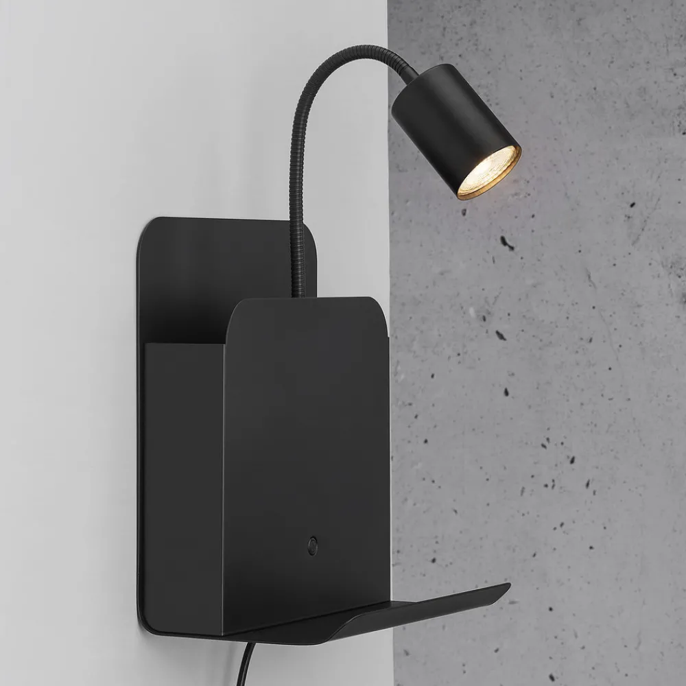 Den Roomi vegglampe lys tilbyr et bredt spekter av bruksområder, fordi den inneholder mange nyttige egenskaper som er spesielt effektive ved siden av sofaen eller sengen. På den ene siden kan lyskilden og dens kjegle justeres fleksibelt. Et rom bak det kan raskt lagre notatbøker eller blader. Roomi har også en USB -tilkobling og et lagringsområde hvor for eksempel mobiltelefonen kan lades og lagres. Alt i alt passer Roomi ikke bare inn i ditt eget soverom, men er også veldig praktisk på hotell- og gjesterom, og takket være den monokrome designen er den veldig enkel å integrere.