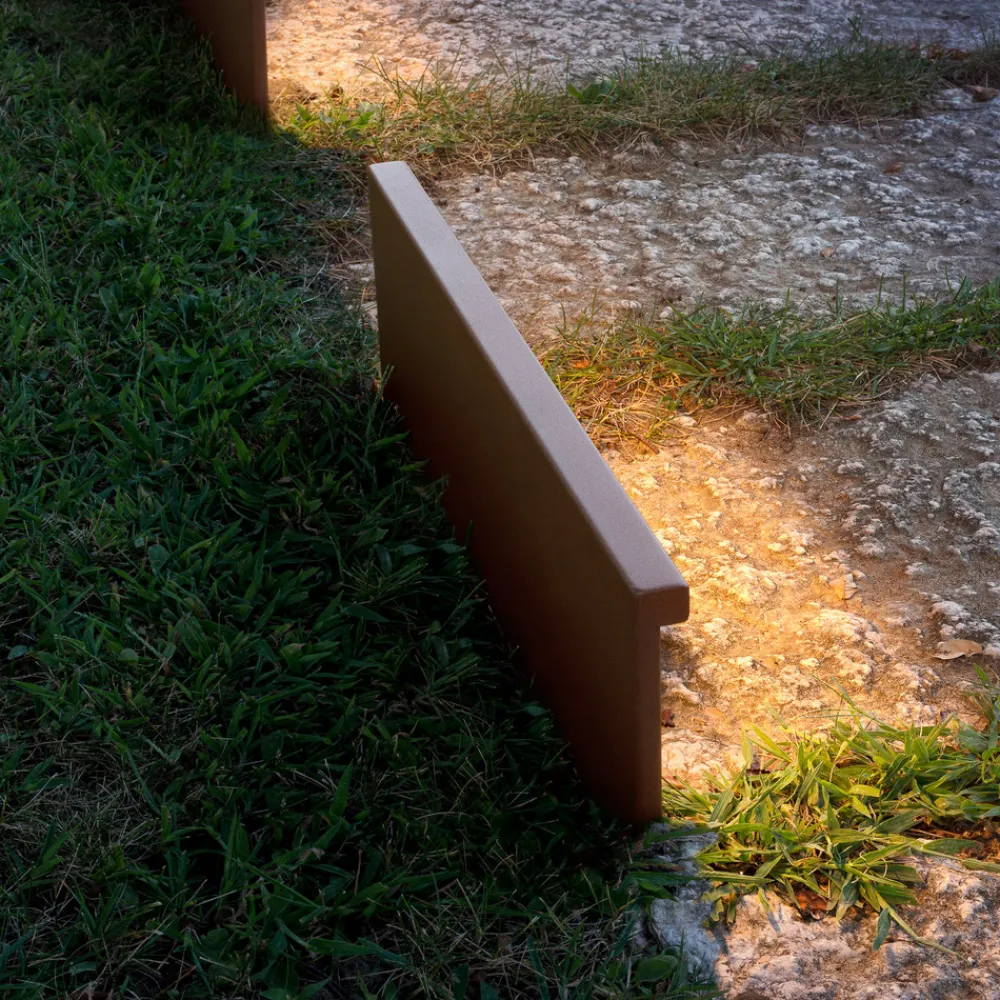 Step Line sokkellampe designet av Diego Chilò tilbyr indirekte lys til den ene siden. Den er laget av rustfritt stål i rektangulær form og har en dekorativ rustfinish. I overkant er det et ensidig fremspring som lysdiodene er integrert under. Lyset deres sendes ut nedover og lyser opp området foran lampen.