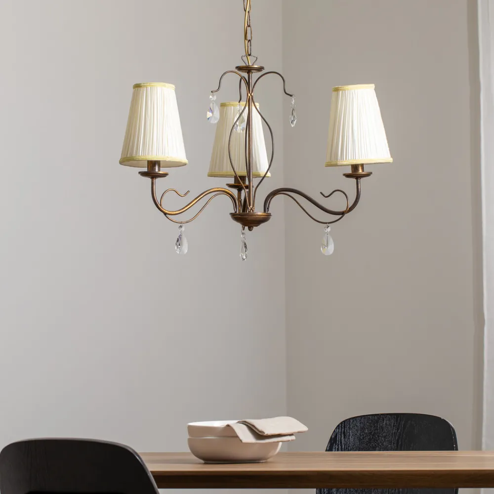 delia 3-lys lysekrone: antikk design møter europeisk produksjon Opplev hvordan Delia 3-lys lysekrone i bronsefarget utførelse tar rommet tilbake til en tid med eleganse og sjarm. Med en diameter på 60 cm blir denne lysekronen et praktfullt midtpunkt i stuer og ganger. Den antikke stilen til Delia-lysekronen, kombinert med den italienske produksjonen av høy kvalitet, skaper en atmosfære som harmonisk kombinerer både historiske og moderne elementer. Hver av de tre tekstilskjermene har plass til én E14-pære (ikke inkludert, se tilbehør).