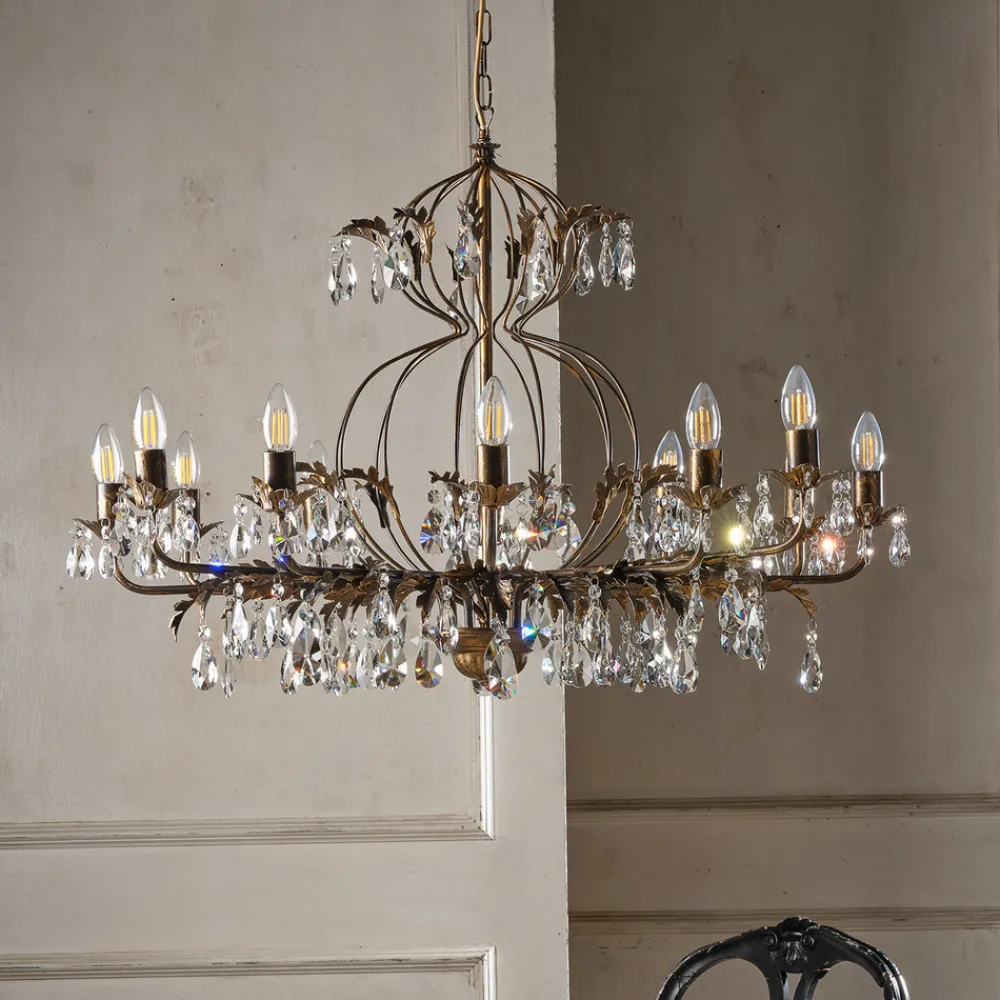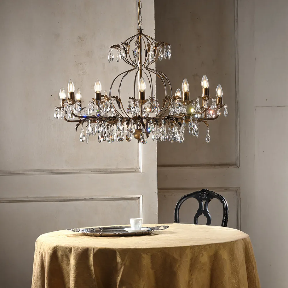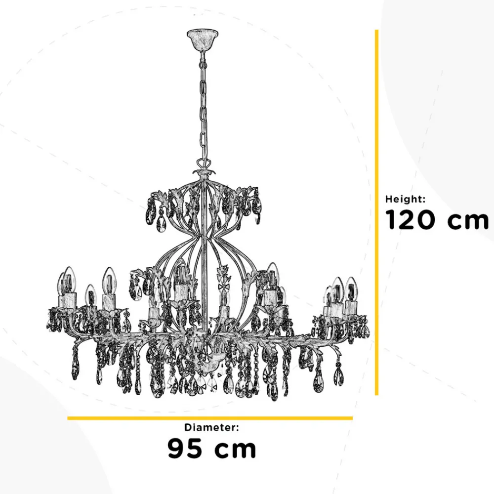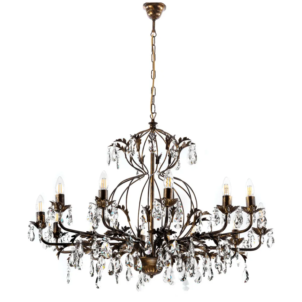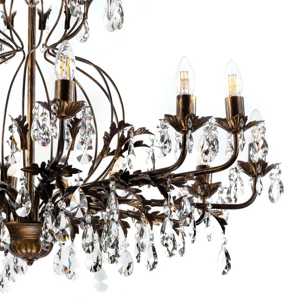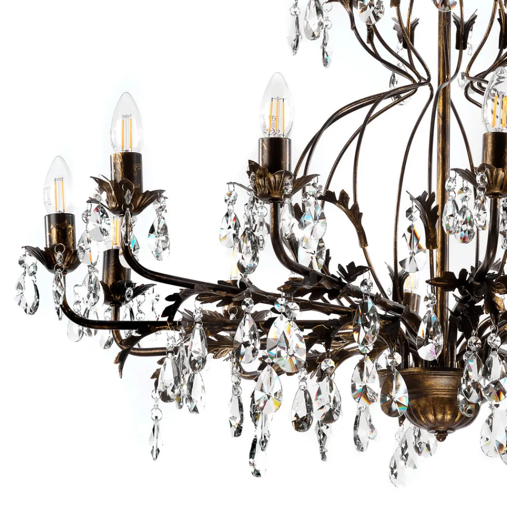 Lysekrone Teresa imponerer med sin antikke stil og bronsefargede overflate, som gir ethvert rom et luksuriøst preg. Med sine 12 flammer sørger den for en imponerende lyssetting, som skaper en stemningsfull atmosfære både i spisestuen og i stuen. Kombinasjonen av metall og krystall gir lysekronen ikke bare en robust struktur, men også en fascinerende lysbrytning som bader rommet i en glitrende atmosfære.