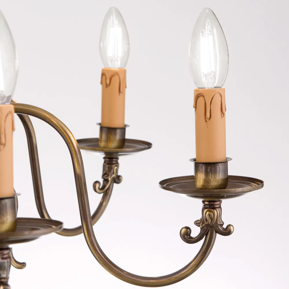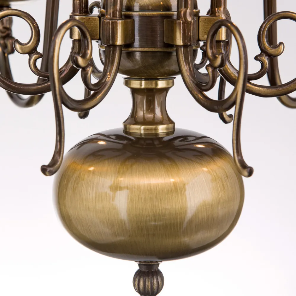 Denne stilekte flamske lysekronen imponerer med sin eksklusive utforming i helstøpt messing. Den håndbehandlede overflaten i antikk messing gir lampen en egen touch. Lysekronen er et naturlig blikkfang i rommet.