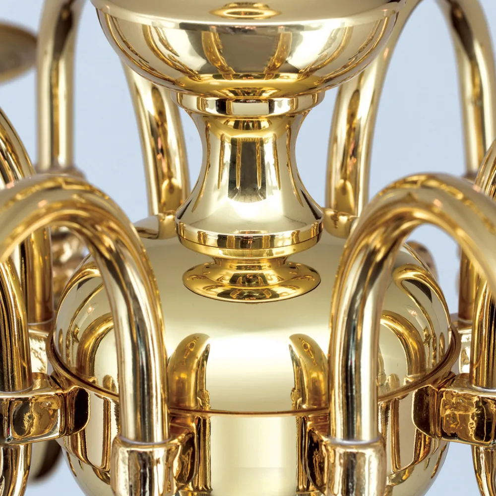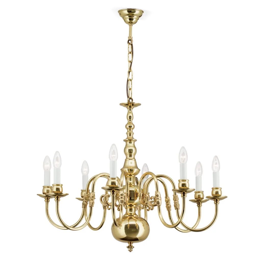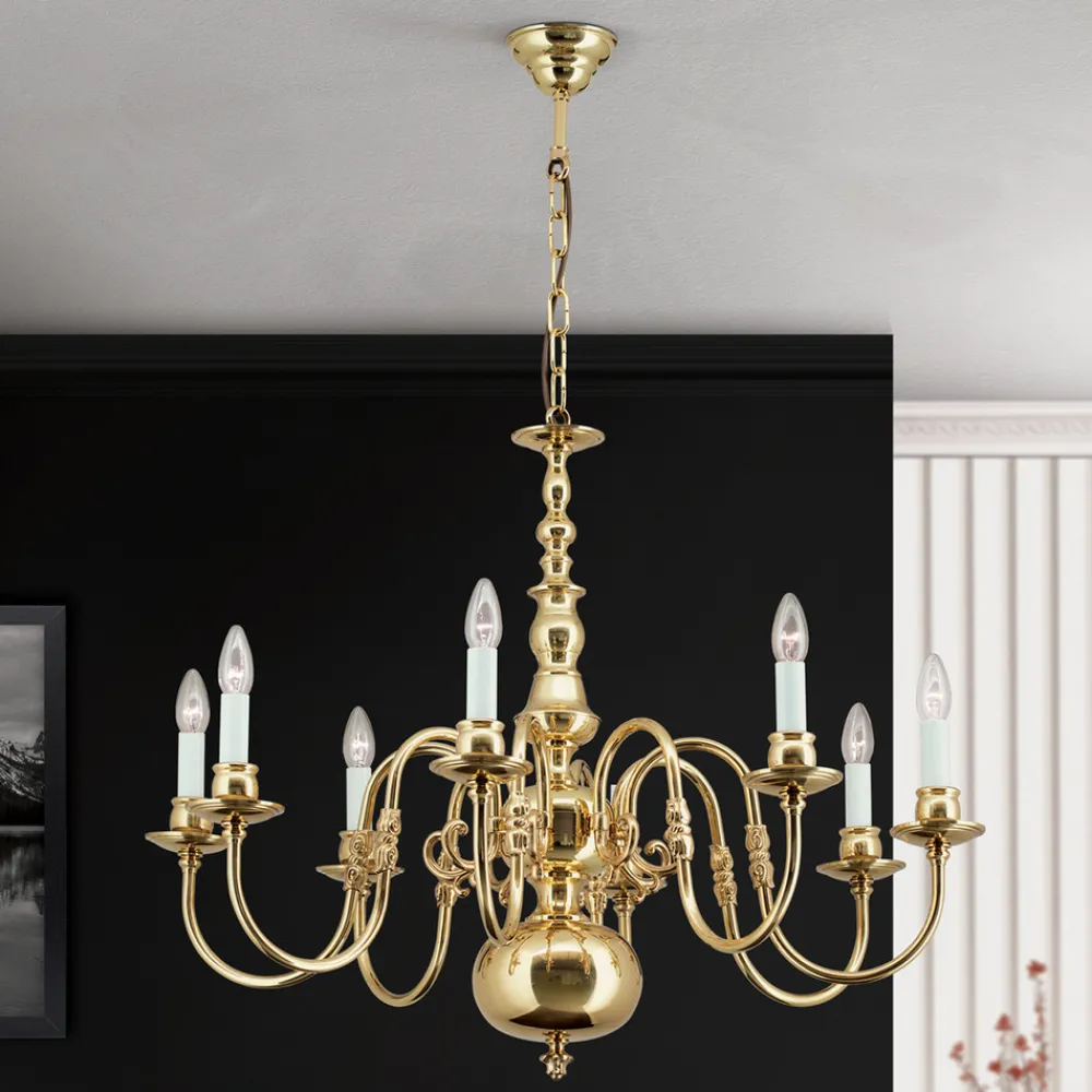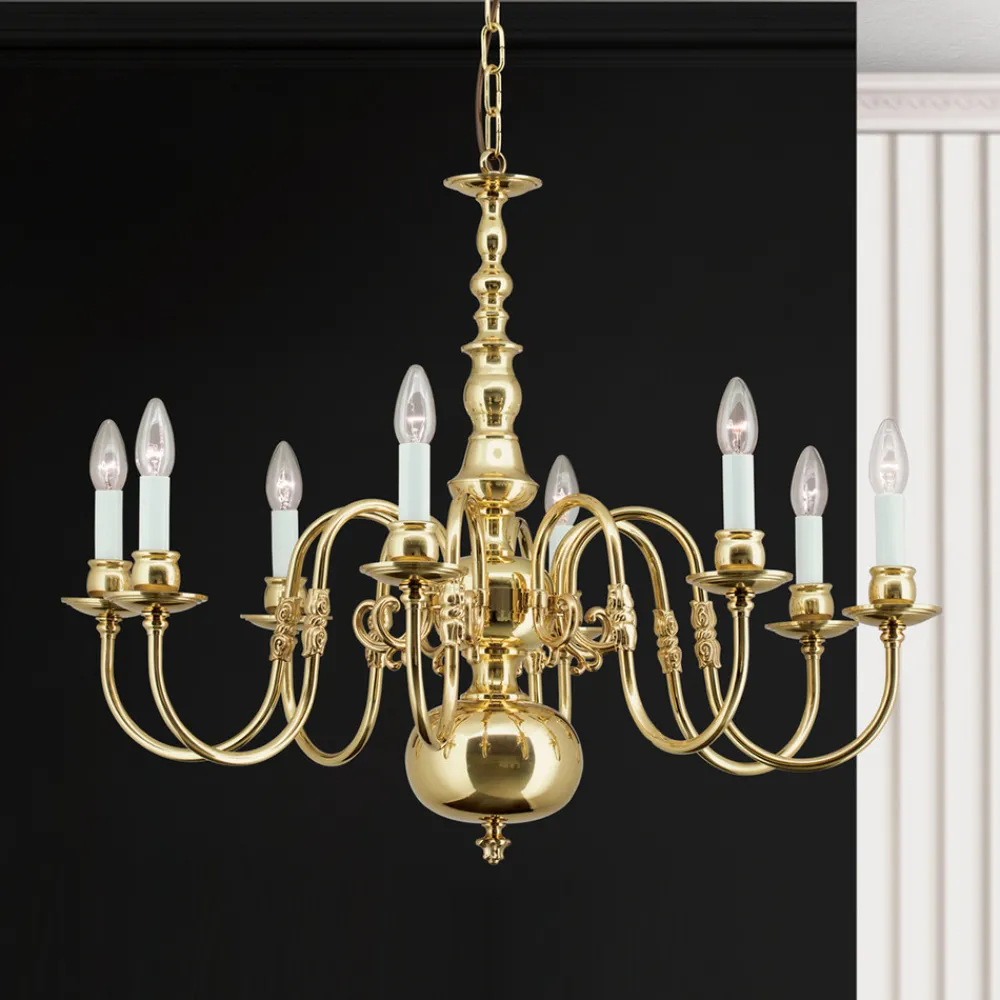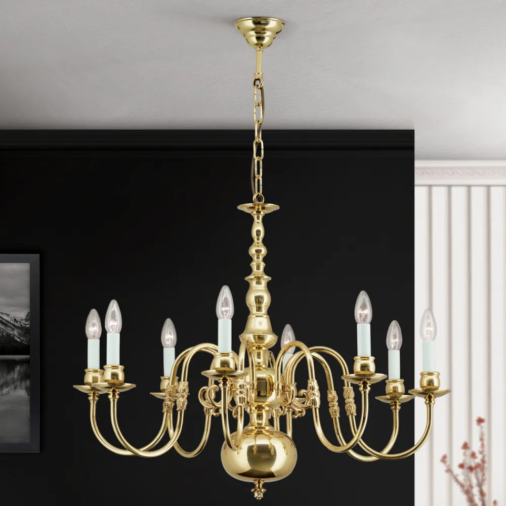 Denne stilriktige flamske lysekronen imponerer med sin eksklusive utforming i messing og støpte komponenter. Messingoverflaten er håndbehandlet og sørger for en helt spesiell glans. Lysekronen er et naturlig blikkfang i rommet.