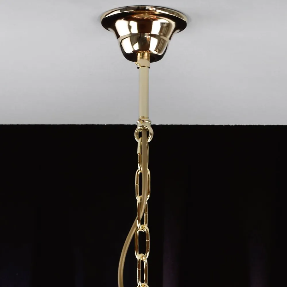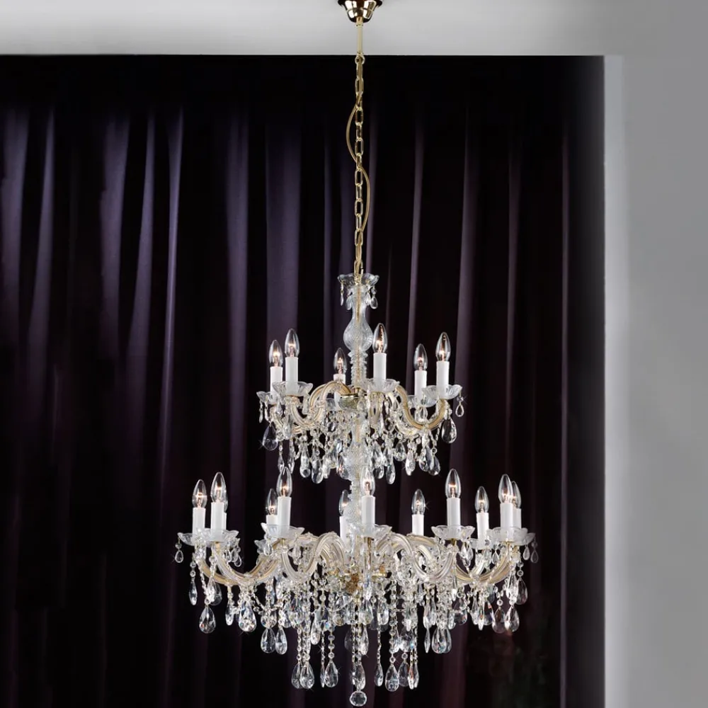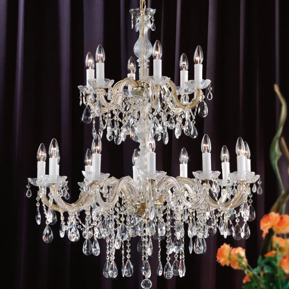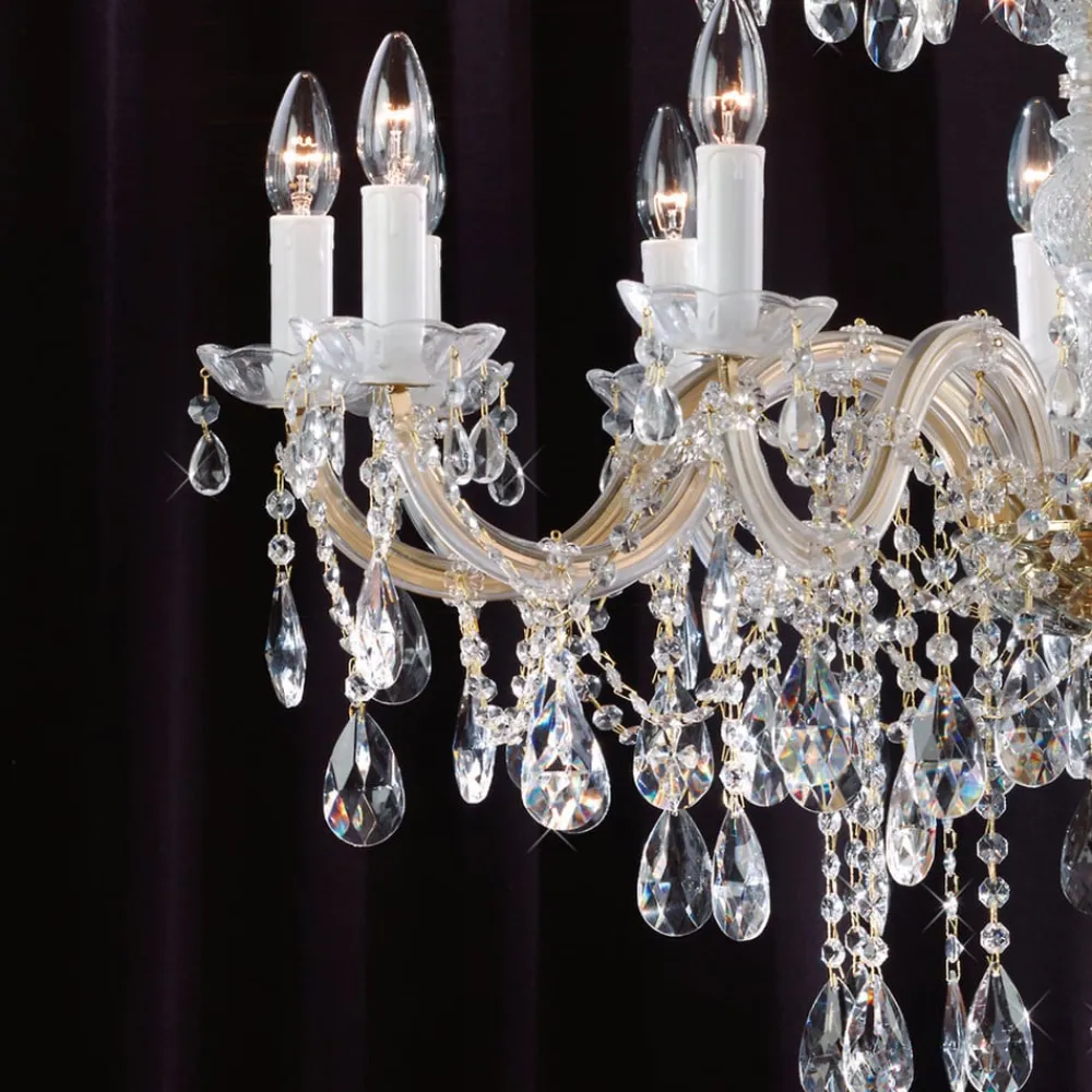 Lysekronen, som har en diameter på 90 cm, imponerer med sine mange stearinlysformede lamper, som skaper en koselig atmosfære i hele rommet når den er slått på. Fargene og formene skaper et sammenhengende kunstverk og minner om fyrstetiden. Perfekt kuttede glasssteiner er satt gjennom hele den gyldne rammen til den svært høye lysekronen, hengende nedover og gir endeløse refleksjoner. Passer til LED eller sparepærer.