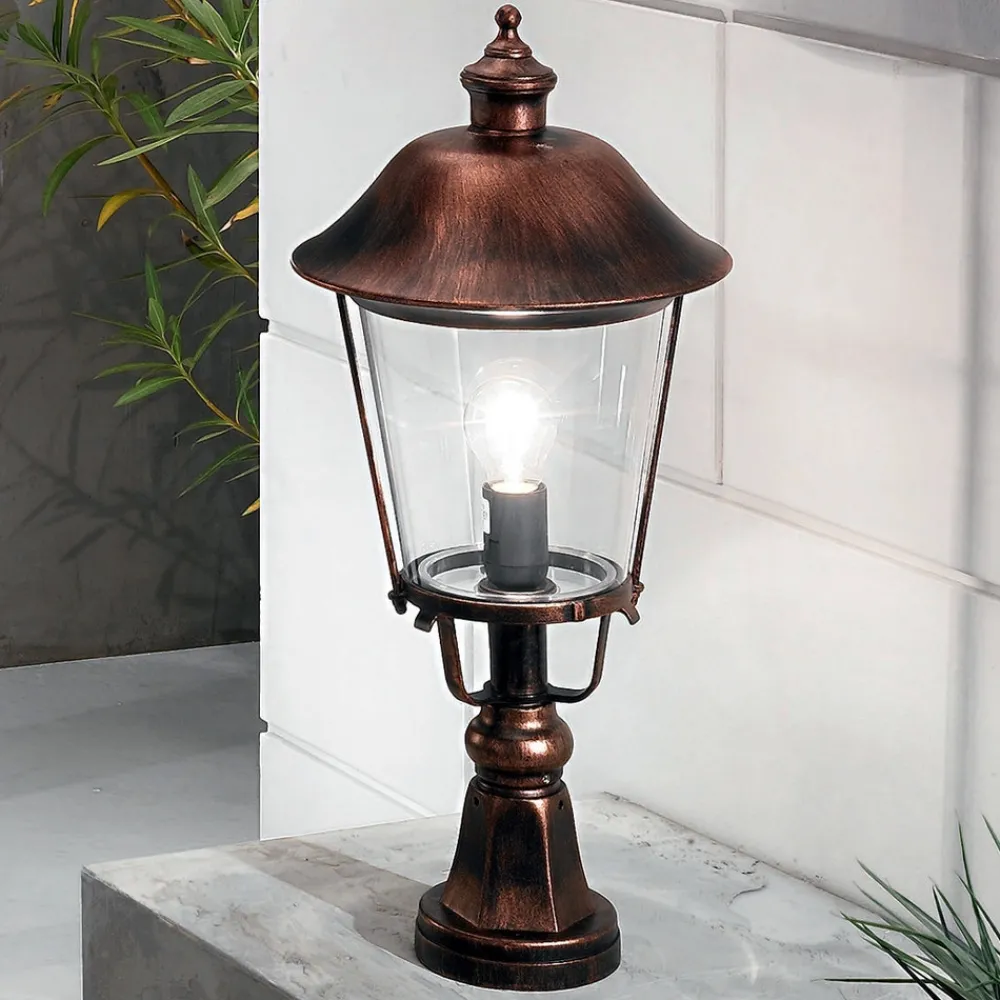 Sokkellampen MARIELLAs skjerm gir lampen en sjarmerende, nostalgisk utstråling. Den ser ut som en klassisk lykt med svart og kobberfarget overflate. Sokkellampen passer godt på en mur eller andre forhøyninger ute rundt huset. Skaper en god atmosfære rundt huset.