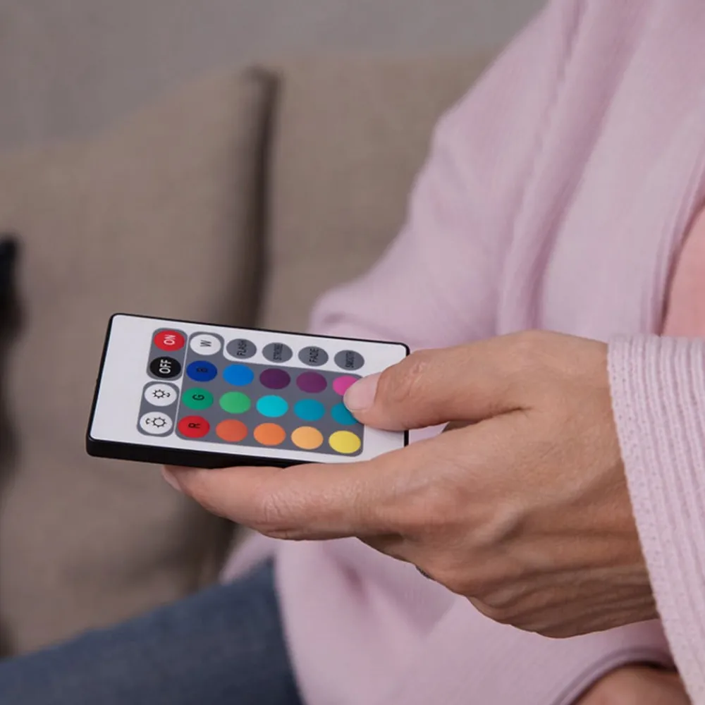Lyset på denne lampen kan justeres komfortabelt og fleksibelt med den medfølgende fjernkontroll . Med denne lyskilden blir en eksisterende lampe med en E14- fatning en trendy lyskilde. Varmhvitt lys, farget belysning, fire forskjellige, forhåndsinnstilte scener og nedblending av lysstyrken i fire nivåer – alt dette er mulig med denne lyskilden fra OSRAM .