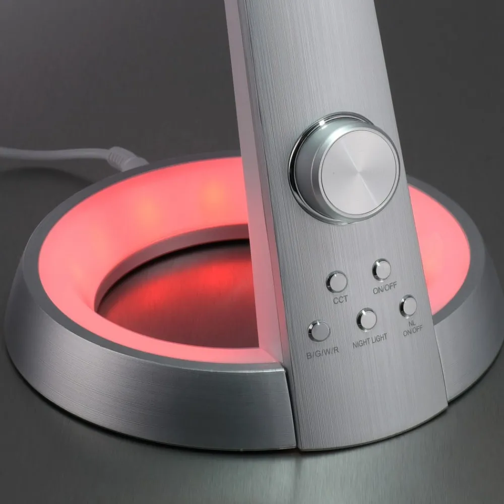 Bill LED-skrivebordslampe med mange funksjoner og USB-tilkobling Bill LED-skrivebordslampe imponerer på den ene siden med sitt flotte design med en rund, ringformet sokkel og en vakkert formet, utstikkende lampearm, og på den andre siden med sin fleksibilitet. Armaturhodet er utstyrt med hvite lysdioder hvis lysfarge kan justeres fra varmhvit til dagslys ved hjelp av CCT-regulering, og lysstyrken kan dimmes trinnløst med dreiebryteren. I sokkelen er det integrert RGB-lysdioder som kan lyse i fargene rødt, grønt eller blått, og lysstyrken kan justeres i tre trinn ved hjelp av en berøringsdimmer. Disse funksjonene gjør det mulig å tilpasse belysningen på arbeidsplassen til personlige preferanser. En USB-port er også integrert i armatursokkelen, slik at en smarttelefon eller et nettbrett kan lades direkte på armaturen.