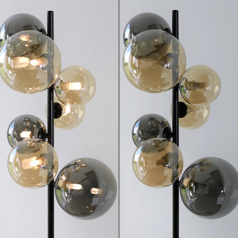 Utskiftbare G9-pærer: Popsicle gulvlampe med fargede glasskjermer Den vakkert designede, svarte Popsicle gulvlampen med ravfargede og røykgrå glasskjermer i forskjellige størrelser lar boligen din skinne i et dekorativt lys. Gulvlampen leveres med syv varmhvite G9 LED-pærer, som avgir et vakkert lysspill gjennom glasset. Lyset kan slås av og på ved hjelp av en fotbryter på kabelen. Plassert i stuen skaper lampen en koselig og hjemmekoselig atmosfære.