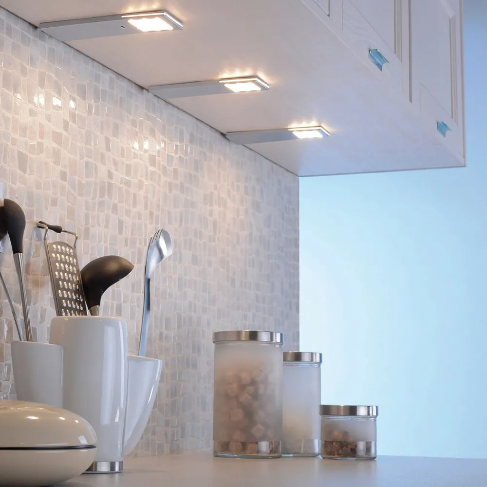 Sett med tre flate, rektangulære Helena LED-benkbelysninger med sensor Helena er en helt moderne LED-benkbelysning som kan brukes til å skape praktisk, varmhvit belysning mange steder. Helena kommer virkelig til sin rett under overskap over benkeplaten på kjøkkenet. Hver av de tre lampene i settet er utstyrt med en 180 cm lang kabel med tilkoblingsplugg. Alle tre lampene slås av og på berøringsfritt ved hjelp av sensorbryteren som er innebygd i en av lampene. De innebygde LED-lampene gir varmhvit belysning. Alle tre lampene forsynes via en felles forsyningskabel med plug-in-transformator.